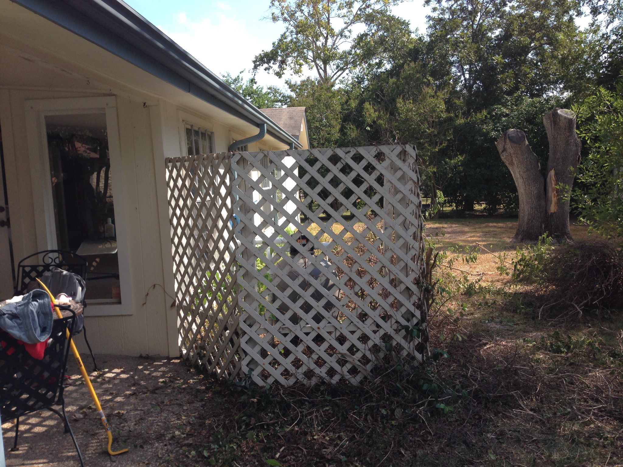 I worked all morning removing the vines from the trellis around the pool equipment. This looked like such an easy task and proved to be the exact opposite. After having a run in with a wasp and Poison Ivy, I decided to take a break from the great outdoors. Tess helped me complete the job in the afternoon and demoed the rickety, oversized pump surround.
