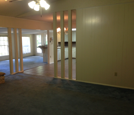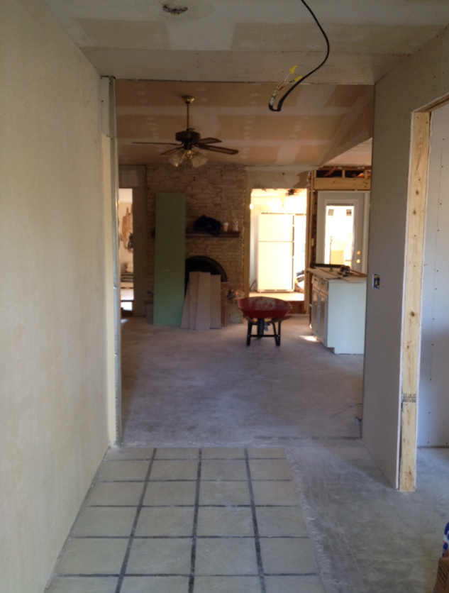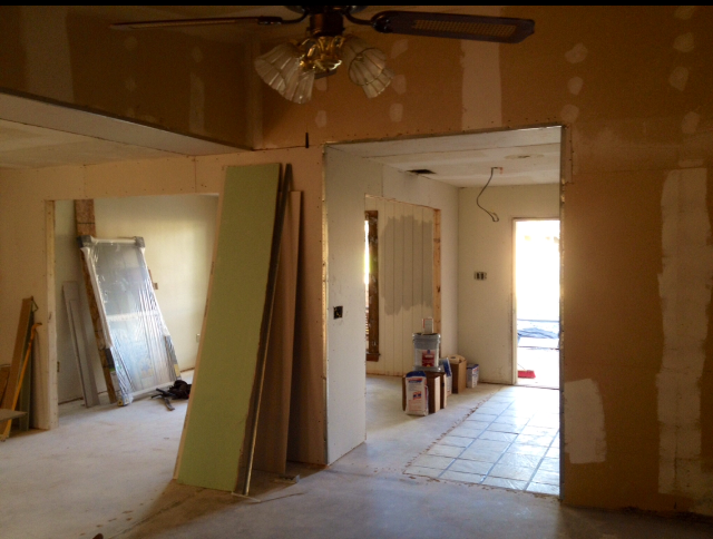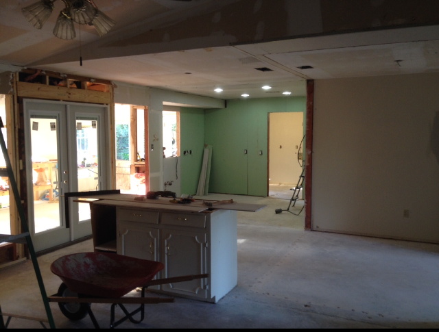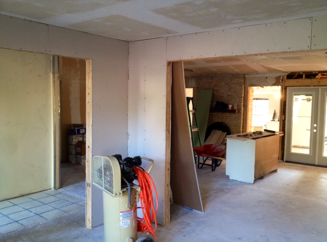 Since I last posted lots has happened around here. We re-ran tons of electrical wiring and installed recessed lighting in the kitchen where the drop ceiling and fluorescent lights used to be. Trent finished all of the framing for the windows and installed the French doors today. With the help of my fabulous father, he hung drywall in the kitchen and the new dining room. I wish I could say that we had paint on the walls but that’s just not the case. The walls underneath the wallpaper and popcorn were in such bad condition that the painters had to spend extra time floating and re-floating and floating some more… Therefore they have yet to begin texturing and painting. We are pretty certain they will begin texturing tomorrow.