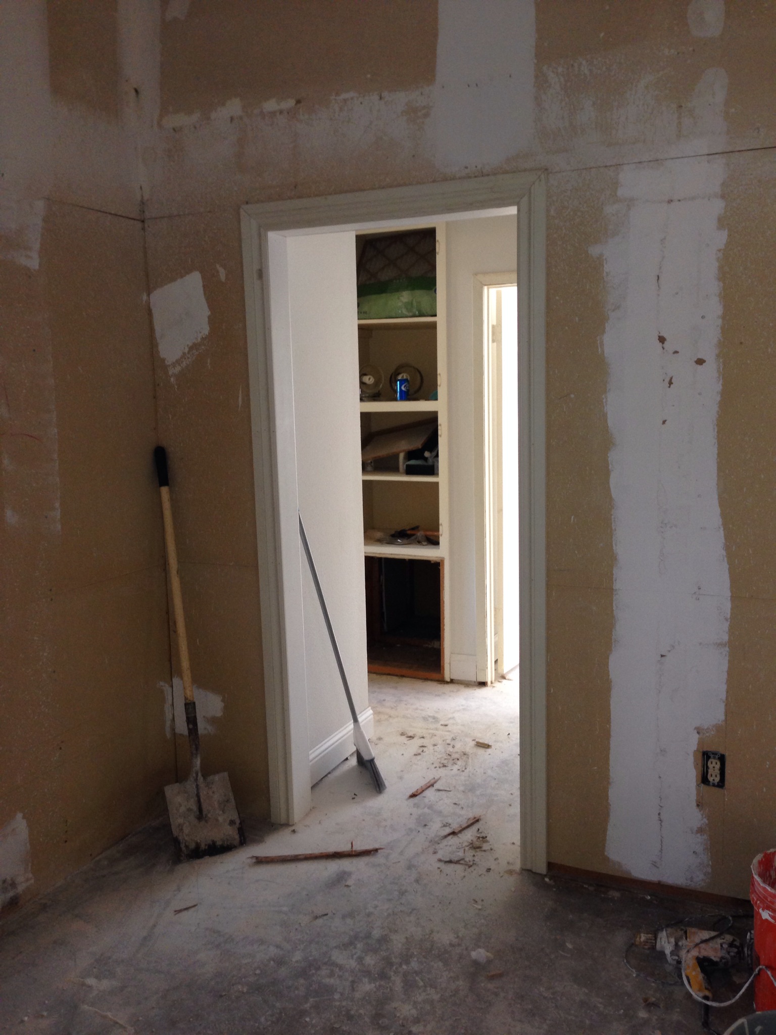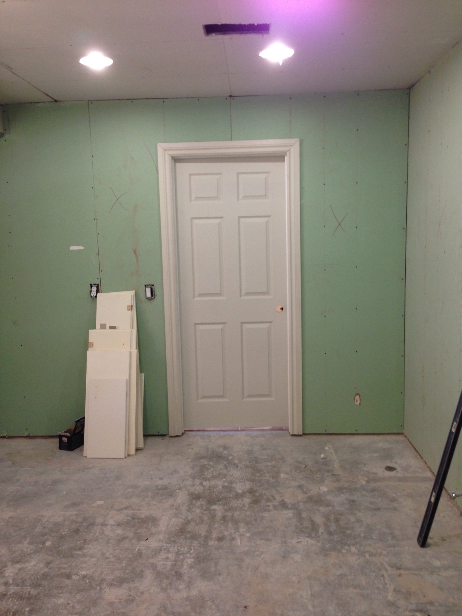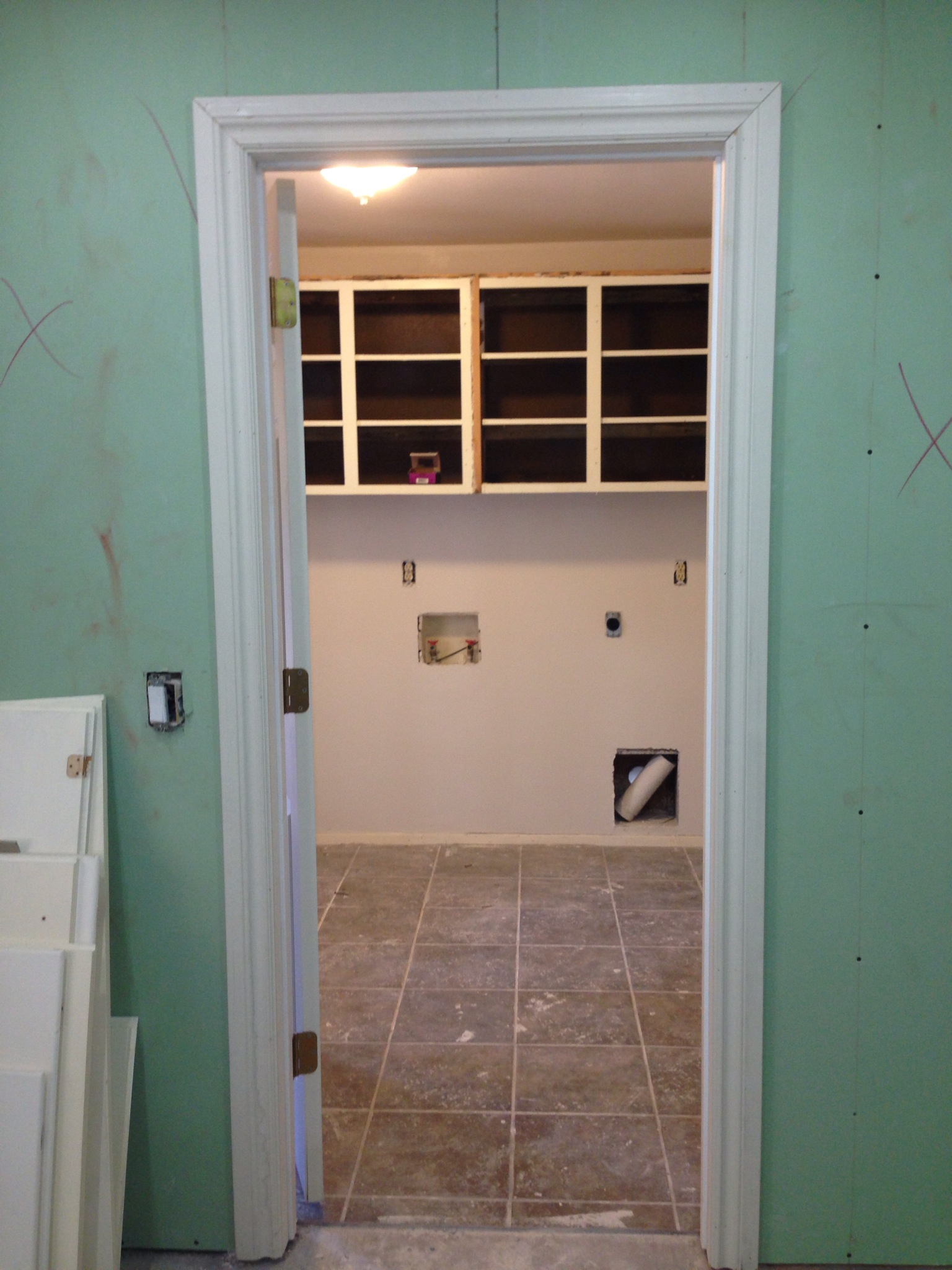 Lastly, Trent and my dad hung the old kitchen upper cabinets in the utility room. We brought the doors home to sand down before the painters get to them.