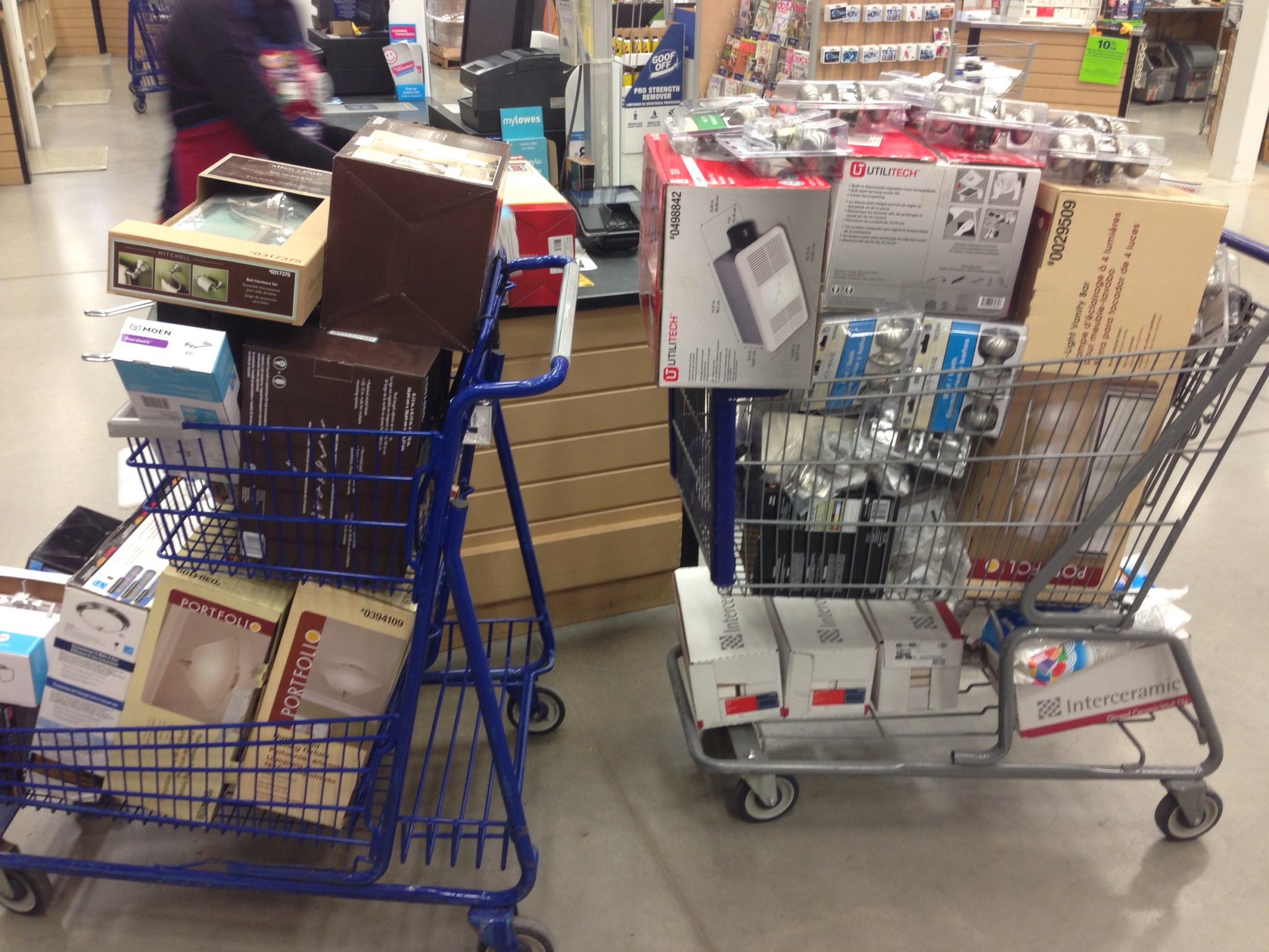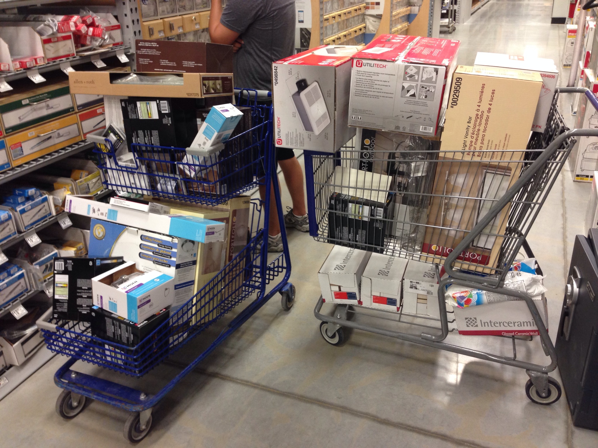 Those carts are filled with light fixtures, door knobs, bathroom hardware, cabinet hardware, exterior light fixtures, tile backsplash and other miscellaneous items that will replace their Ugly counterpart. Not pictured is a utility sink to go in our laundry room. This was not originally something that we planned to purchase, but decided to since we will not have a kitchen sink for the first few weeks that we live in the house. Though this was a fun shopping trip, we knew that we were wasting away our big moving day.