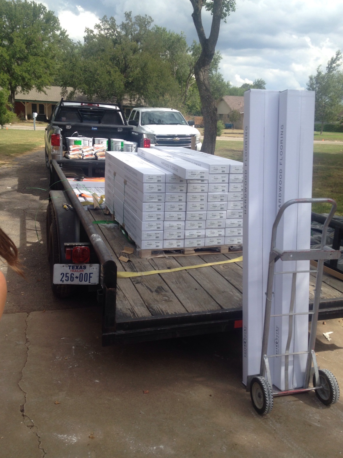 Though we don't have floors installed yet, Trent did go to pick them up. 3 times that is… We purchased the floors through one of Trent's flooring subs in order to get a good deal. We ordered them about a month ago and got the call that they were in and ready for pick up. Yay! Or so I thought. Trent borrowed my dads truck and trailer in preparation to haul them home. He gassed up and headed to North Austin only to be told upon arrival that our floors had been shipped to the Dallas location rather than to Austin. Womp Womp. We were disappointed that time had been wasted, but were relieved that they could have them in Austin the following day. The next day when Trent arrived to pick them up he realized that they were 3"-5"-7" combination boards rather than the 5" boards that we had ordered. Unbelievable, right?! When he informed the salesman of this, he notified Trent that they don't even make the wood we ordered in a 5" wide panel. At this point I was kind of glad that there was a mix up. When we first looked at flooring samples I was drawn to the wider plank boards, but convinced myself to go with 5" boards out of fear that the wider planks were too trendy. I wasn't really happy with my decision but made it by convincing myself that it was the safer route. Safe or not, I ultimately liked the look of the 7" board so that was what we decided to go with. And sure enough, on the 3rd trip to North Austin Trent left with flooring. And a LOT of it!