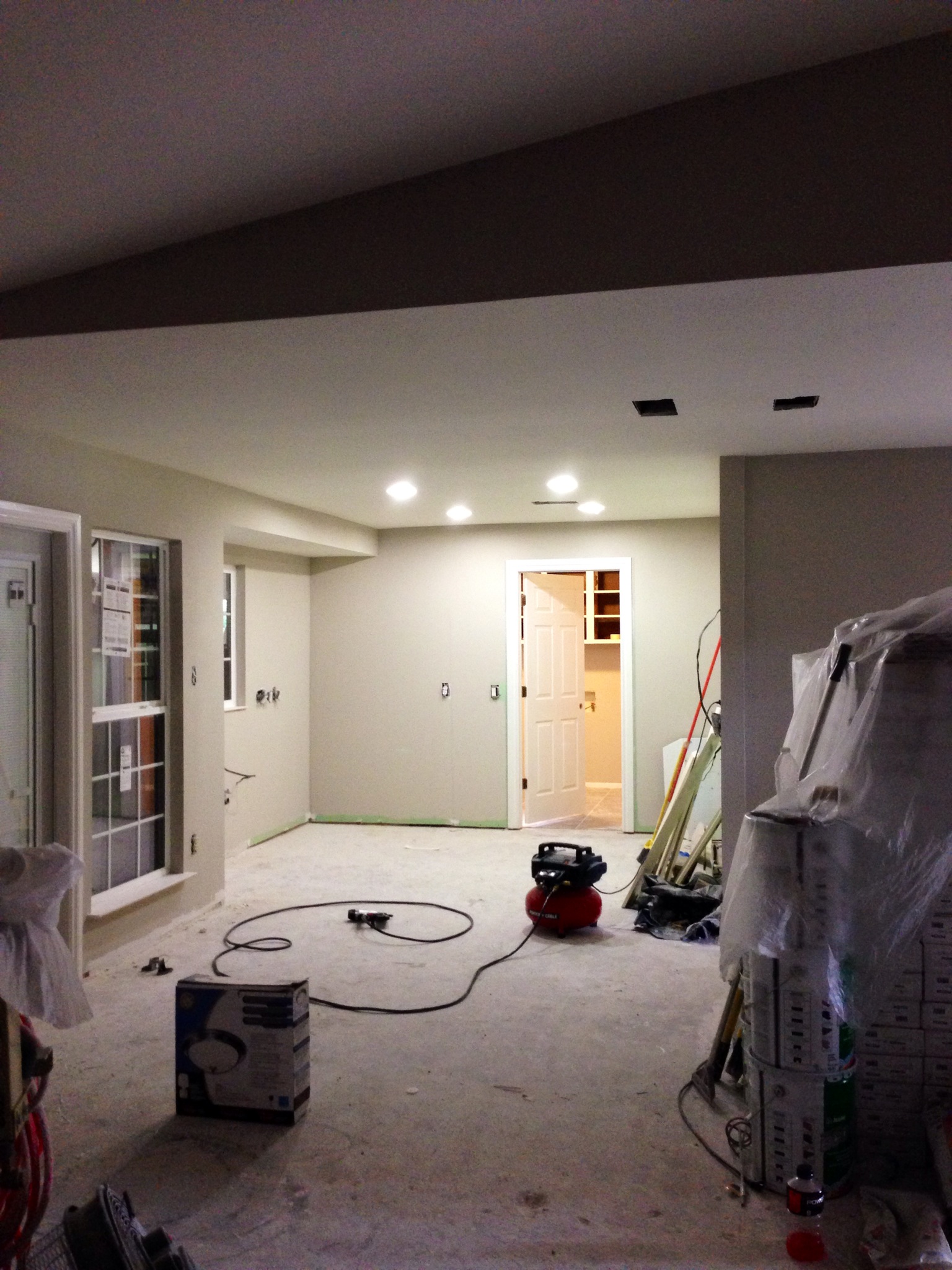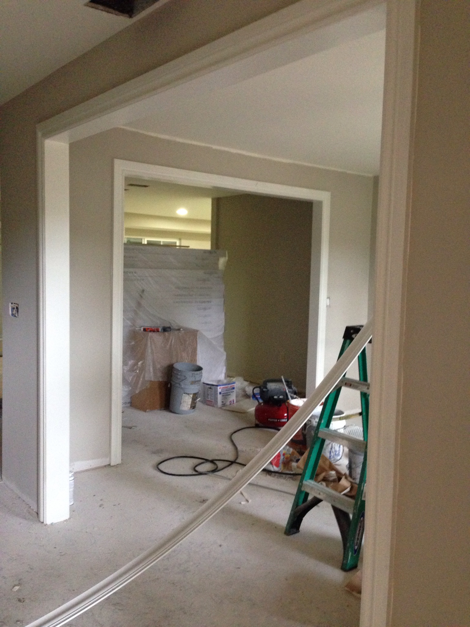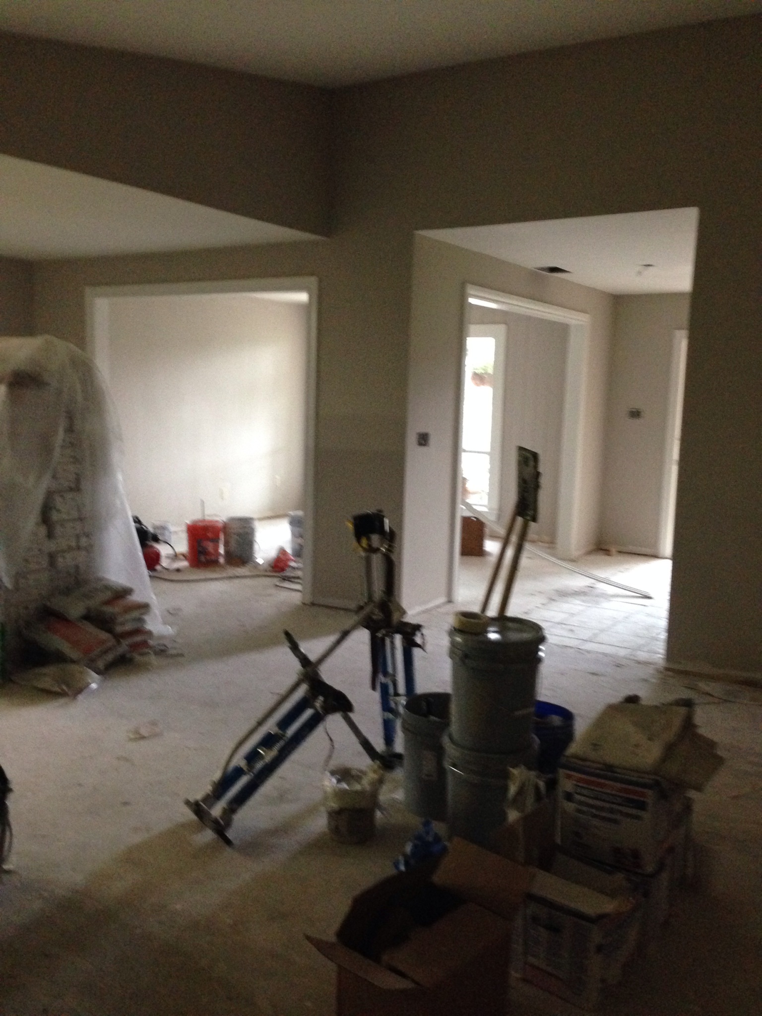Oil based paint fumes are thick in the air of Ugly House, which means trim has been painted, which means walls have been painted, which means I am HAPPY! They FINALLY completed all painting in the house with the exception of the baseboards in the common areas, the crown molding in the dining room and doors for built in cabinetry, which have all yet to be installed. They plan to paint all said items tomorrow and Trent will install them once the paint dries. This place is so close to being pretty that it’s crazy!