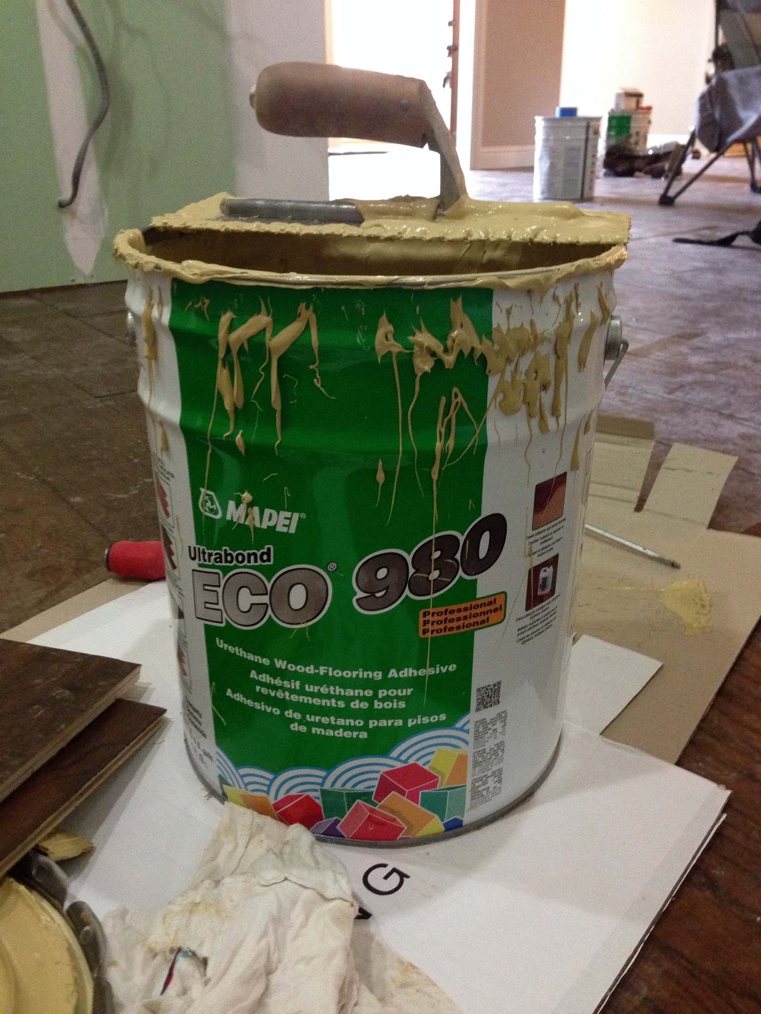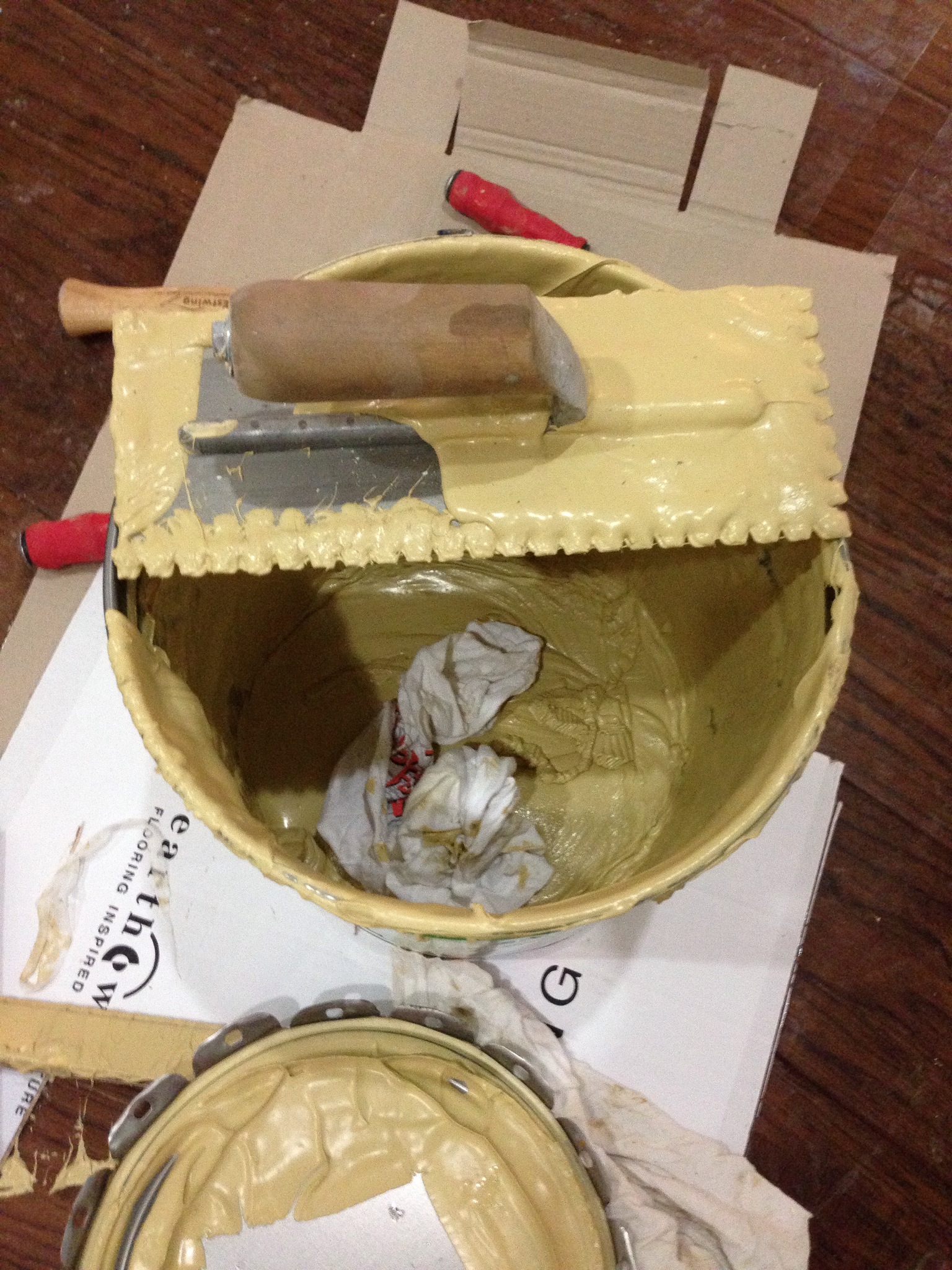 These buckets cost about $100 a piece and weigh like a million pounds. Okay, more like 80 pounds, but sheesh, that’s a small human. They are VERY heavy, simply put. Not only is this stuff heavy and pricey, it sticks like a fly in honey. Once you touch it, it’s on you for life. Or for the next week or so. The same goes for the glue on the floor. Unfortunately, the guys were working under a time crunch and in poor lighting, causing them to track glue EVERYWHERE. Thus far I have spent about 5 hours crouched down rubbing mineral spirits all over the floor in an attempt to remove it. I still have about half of the house left. Lesson learned here is clean the glue up right away. It cures after 24-48 hours and it’s removal is making my life miserable.