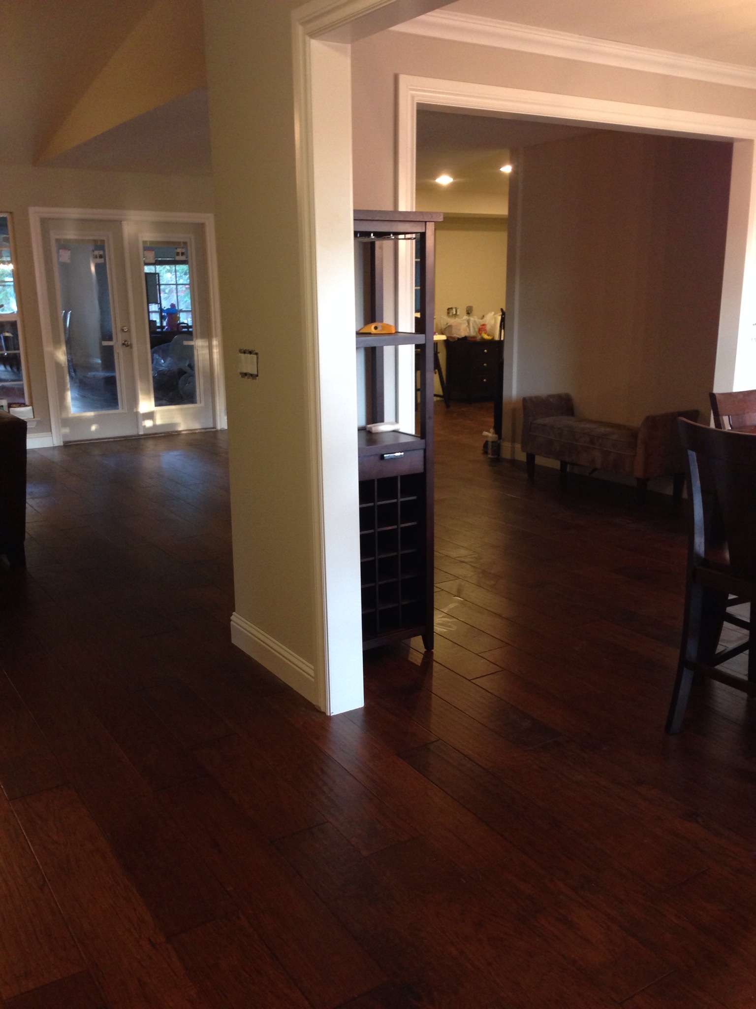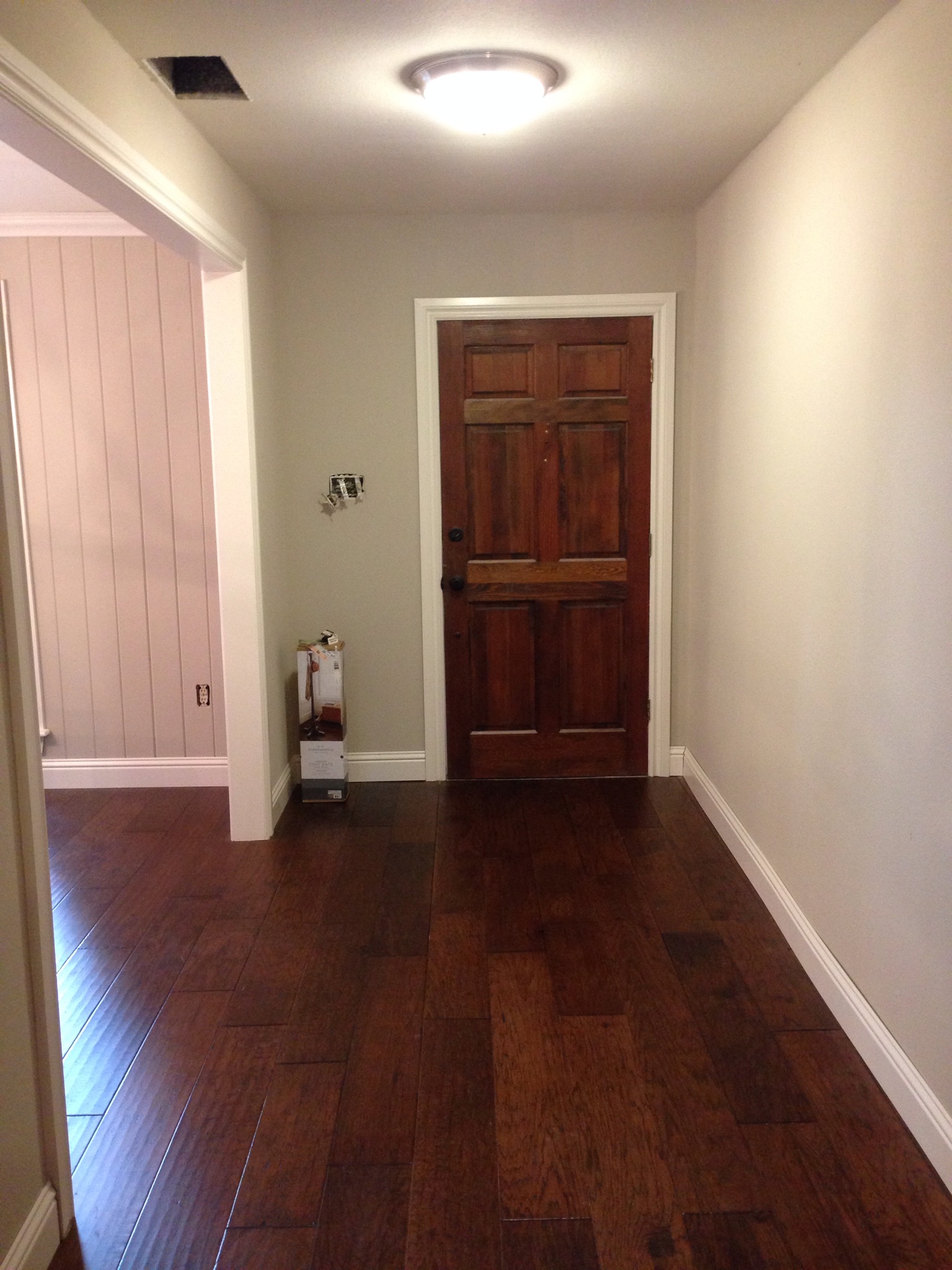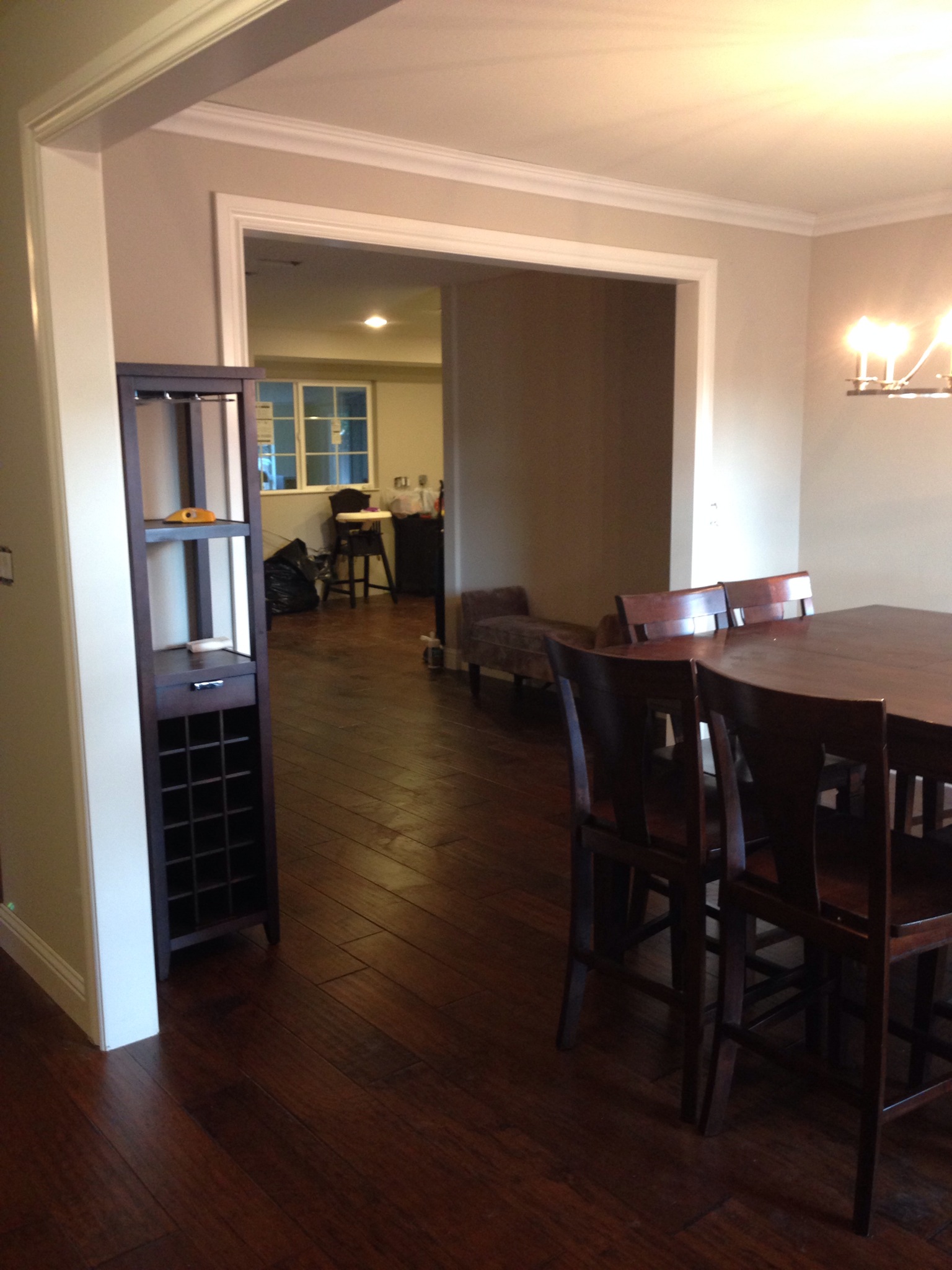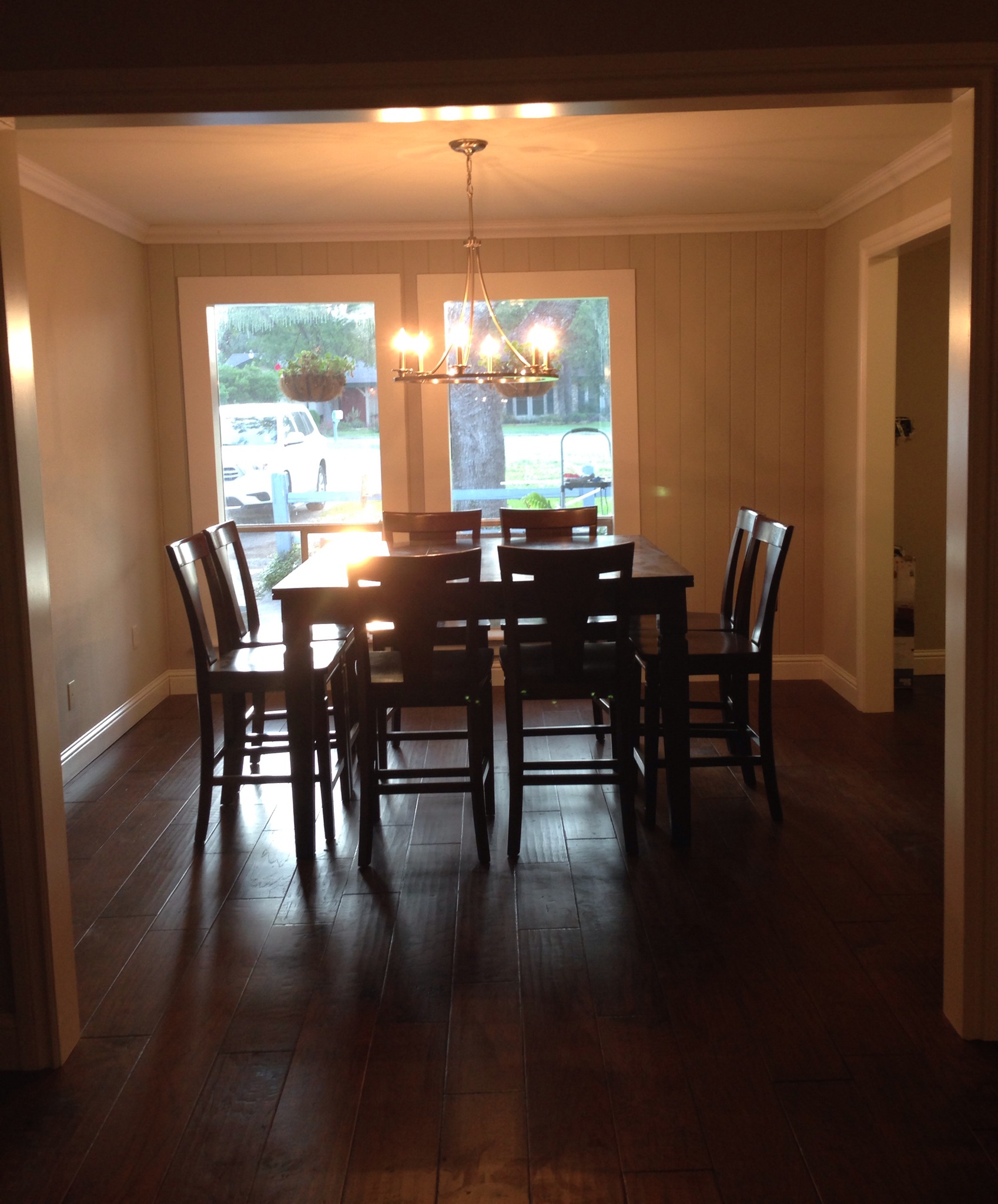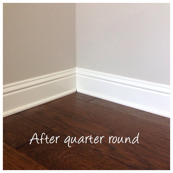 Since the floors were knocked out on Saturday, Trent had all day Sunday to install the quarter round molding in the bedroom wing, all baseboards in the common areas, and crown molding in the dining room. I thought the house looked good as soon as the floors were in, but all this trim made it look so polished. We still need to caulk it all, but for now it works.