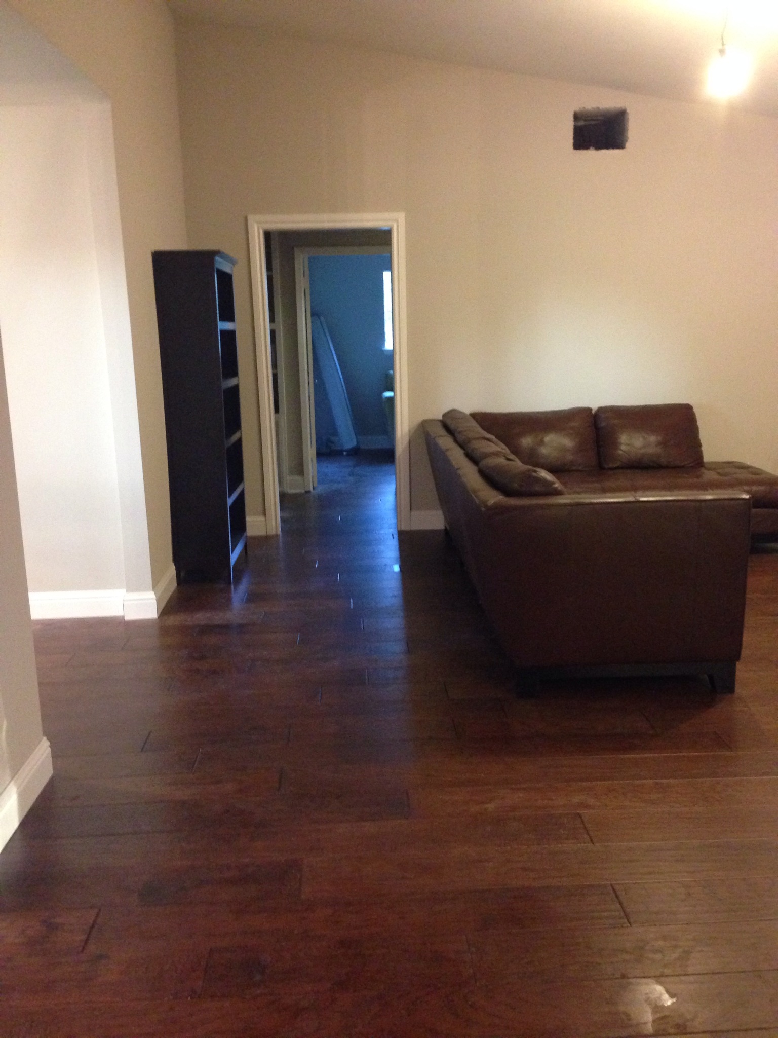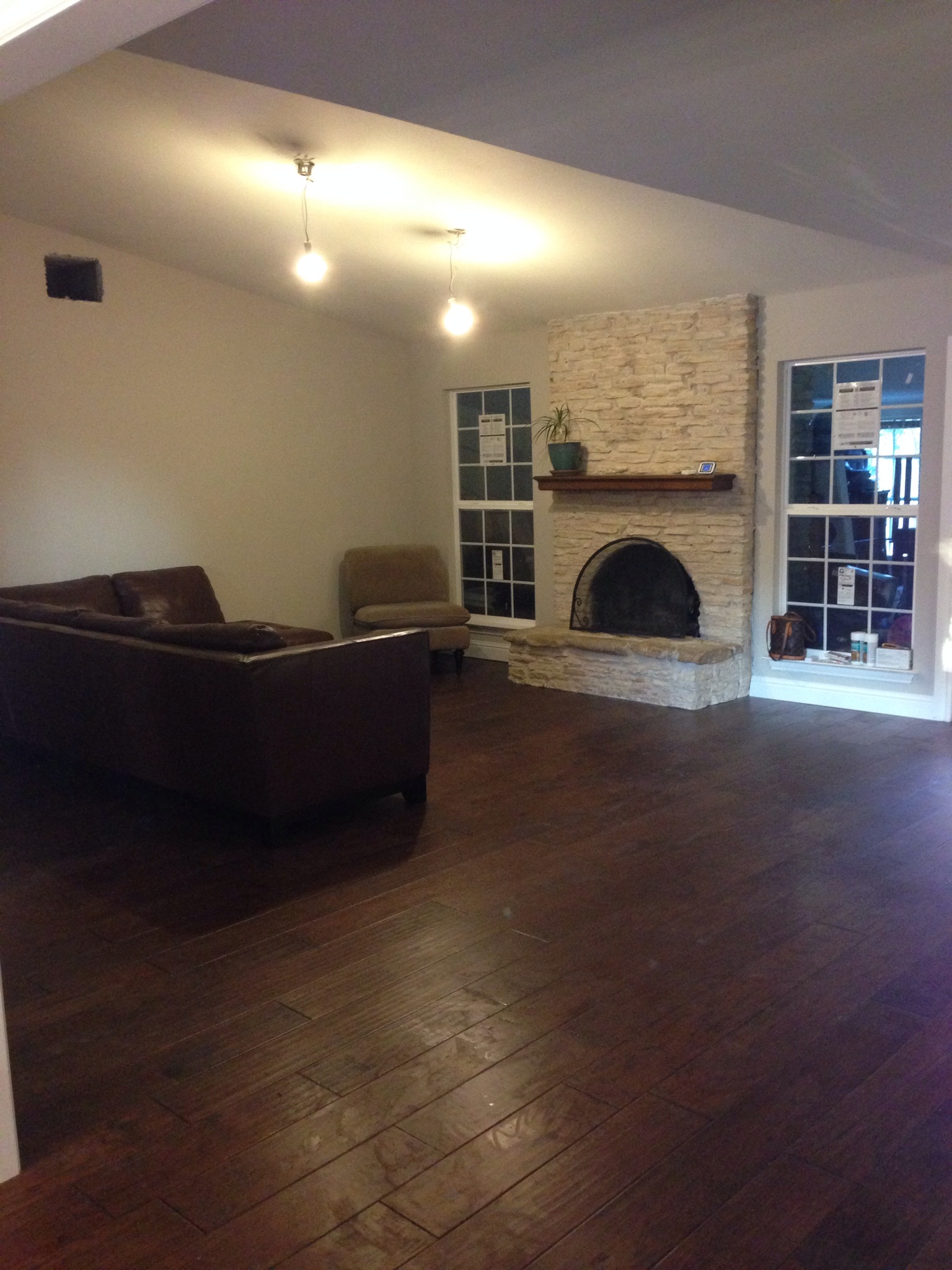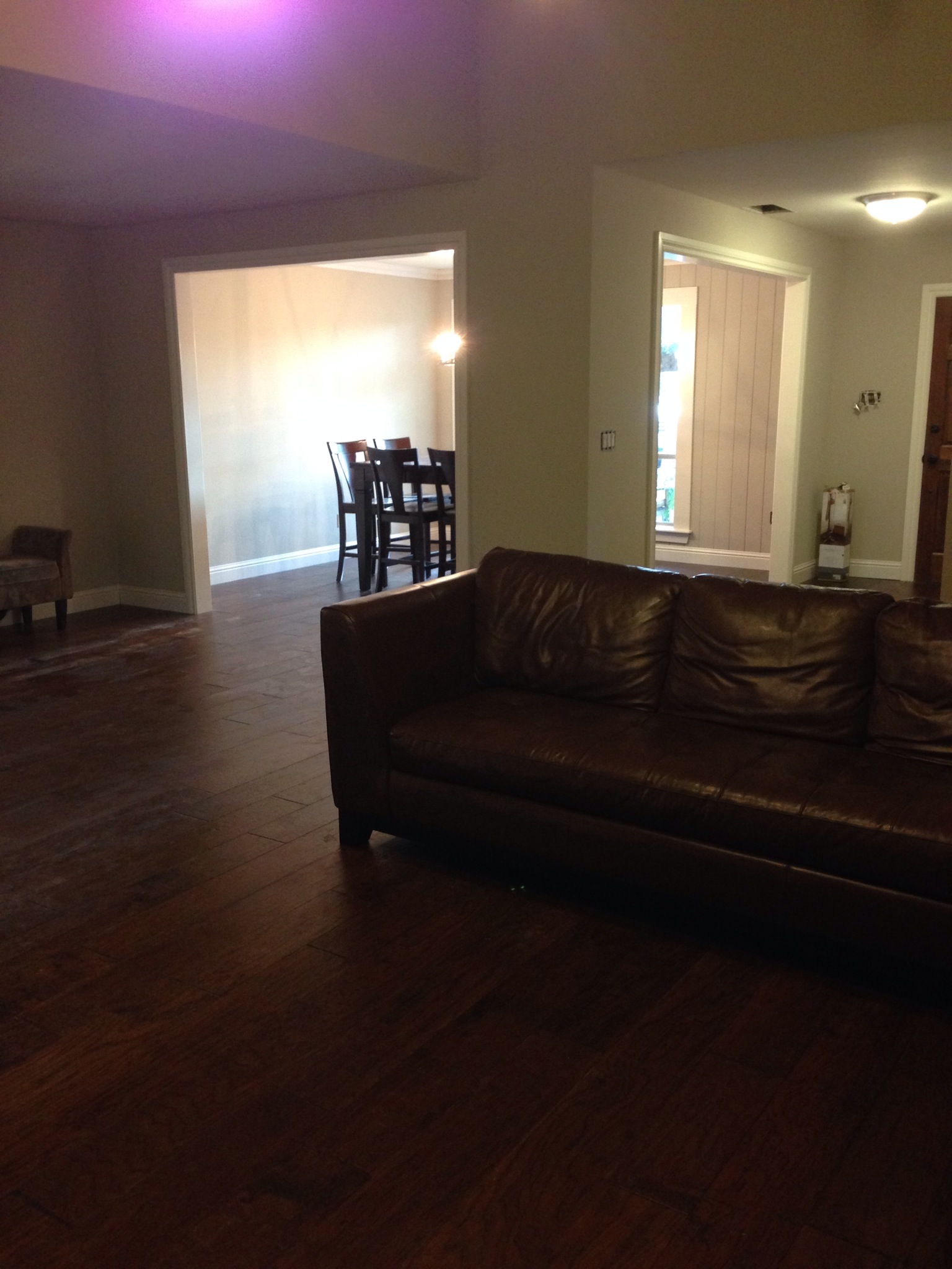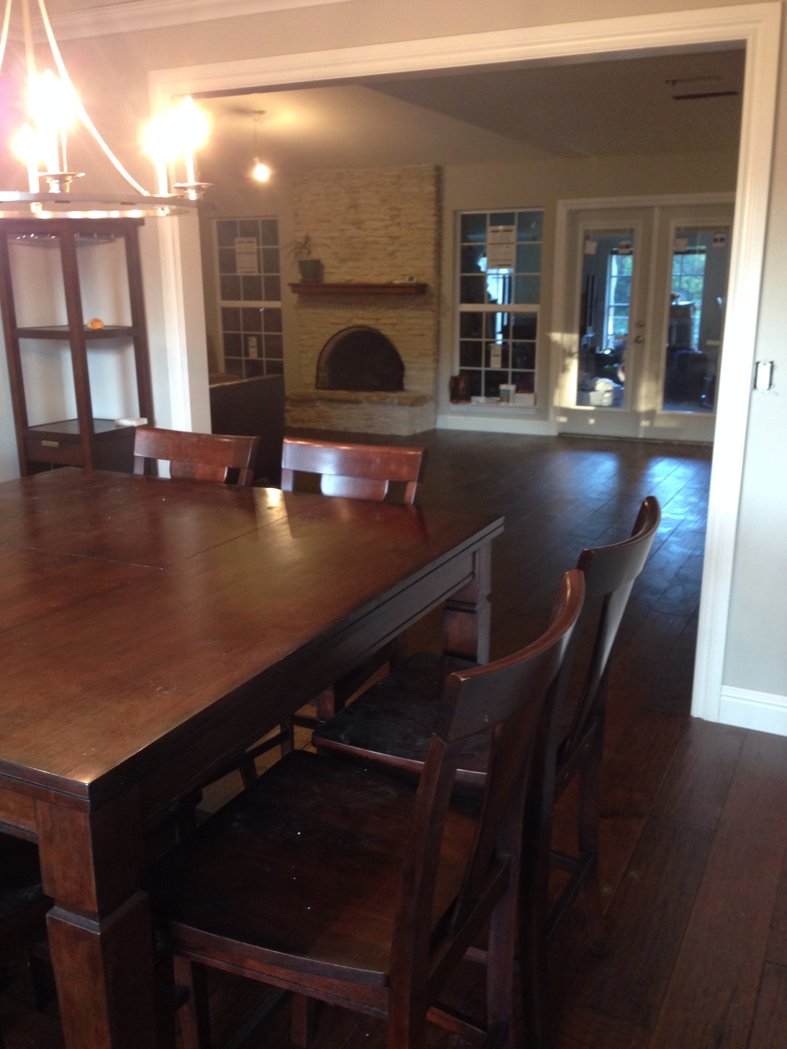 The biggest thing that has changed since the last post is that we have wood floors! Everywhere! Saturday morning our living room, dining room, kitchen and guest bedroom had really dusty concrete floors. By Saturday night all of those rooms had REALLY dusty wood floors!! Hallelujah! Trent had anticipated that they would only finish about half of what they did, so we were pleasantly surprised with the completion. Trent, his friend Austin, and Ramon the carpenter, are now all wood floor installing pros!
