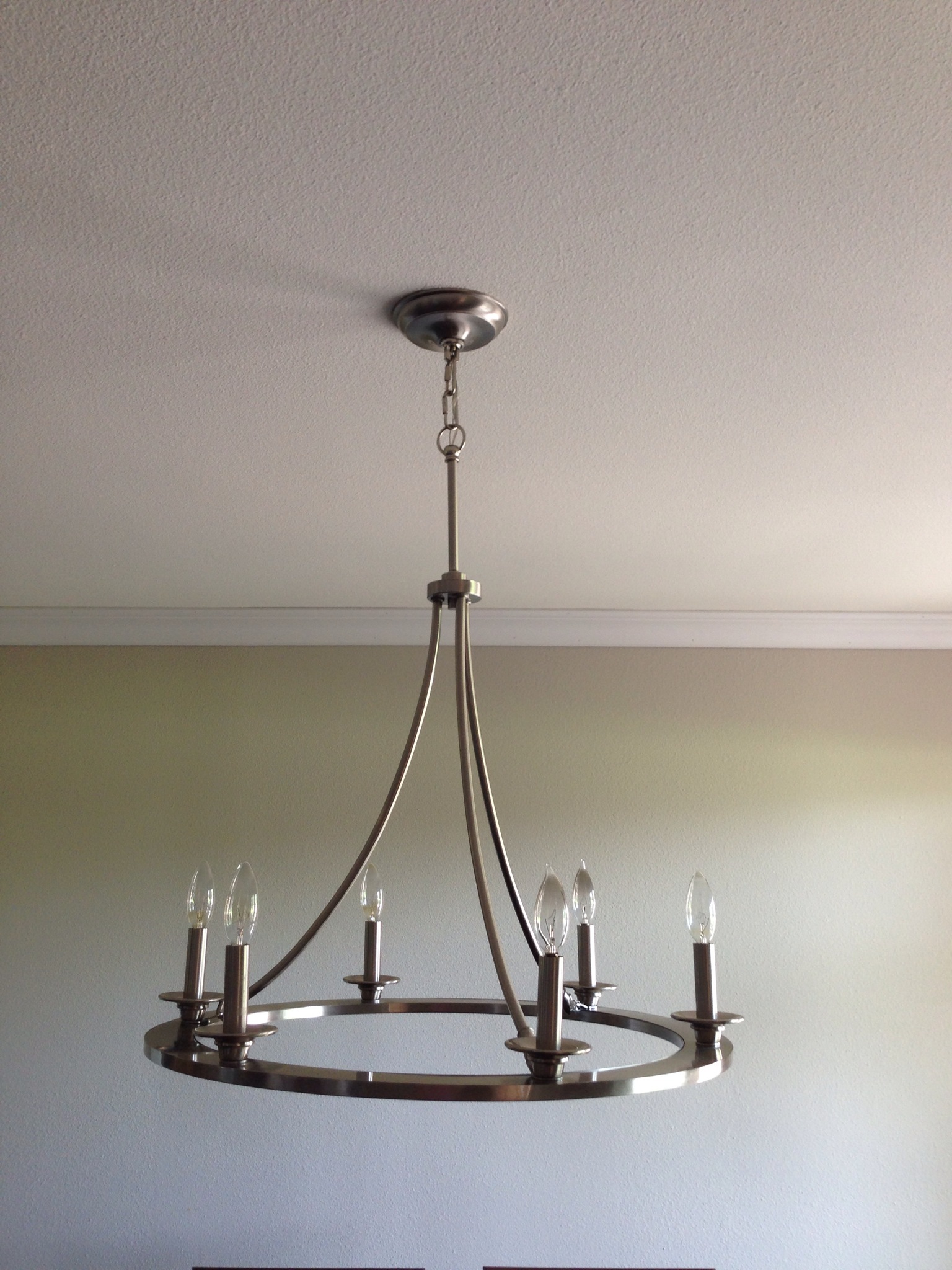 After lots of searching I finally found a ceiling fan that I liked from Overstock.com. We received it last week but need to special order the down rod for it, so Trent rigged some temporary living room lighting for the time being.