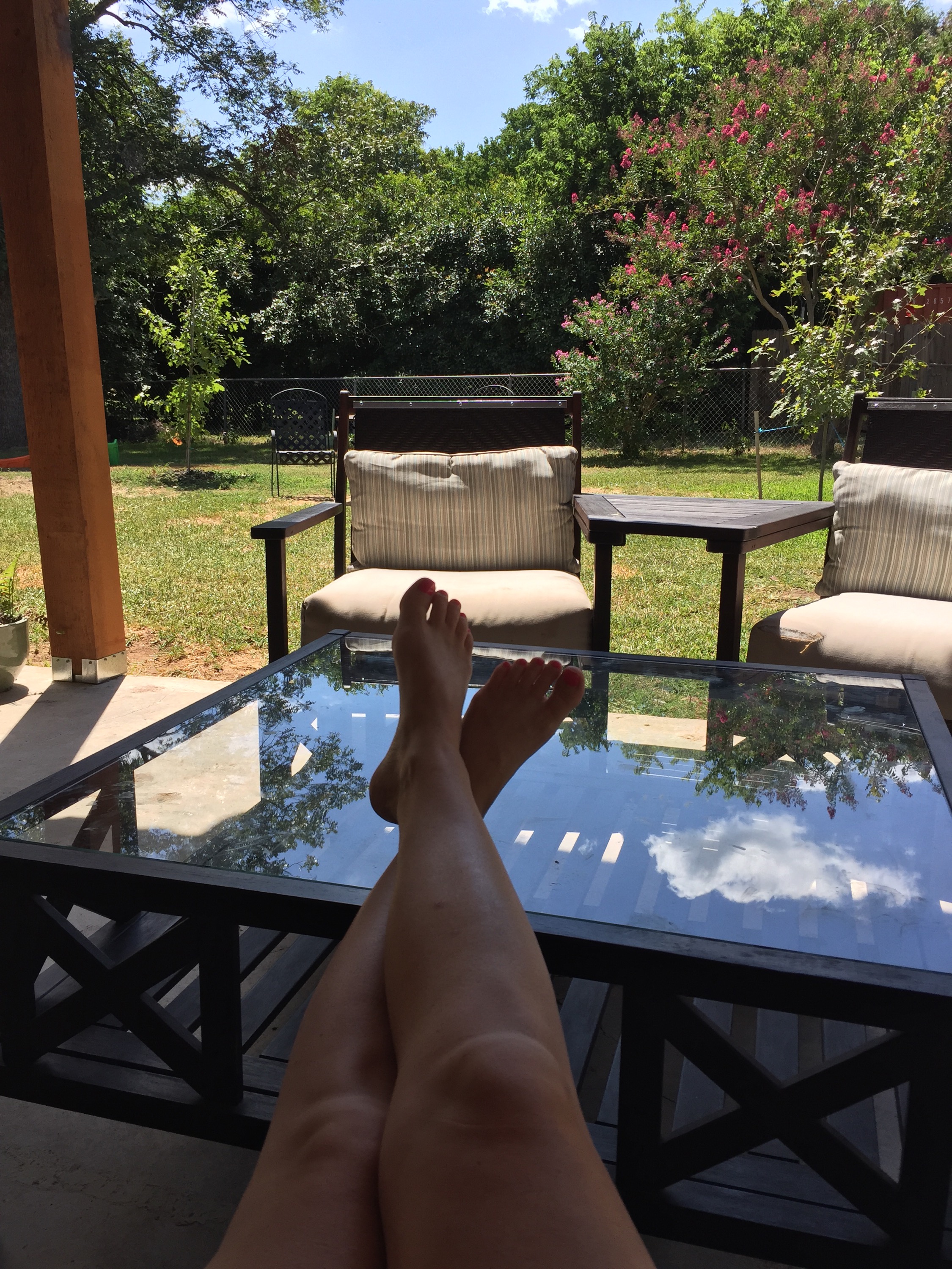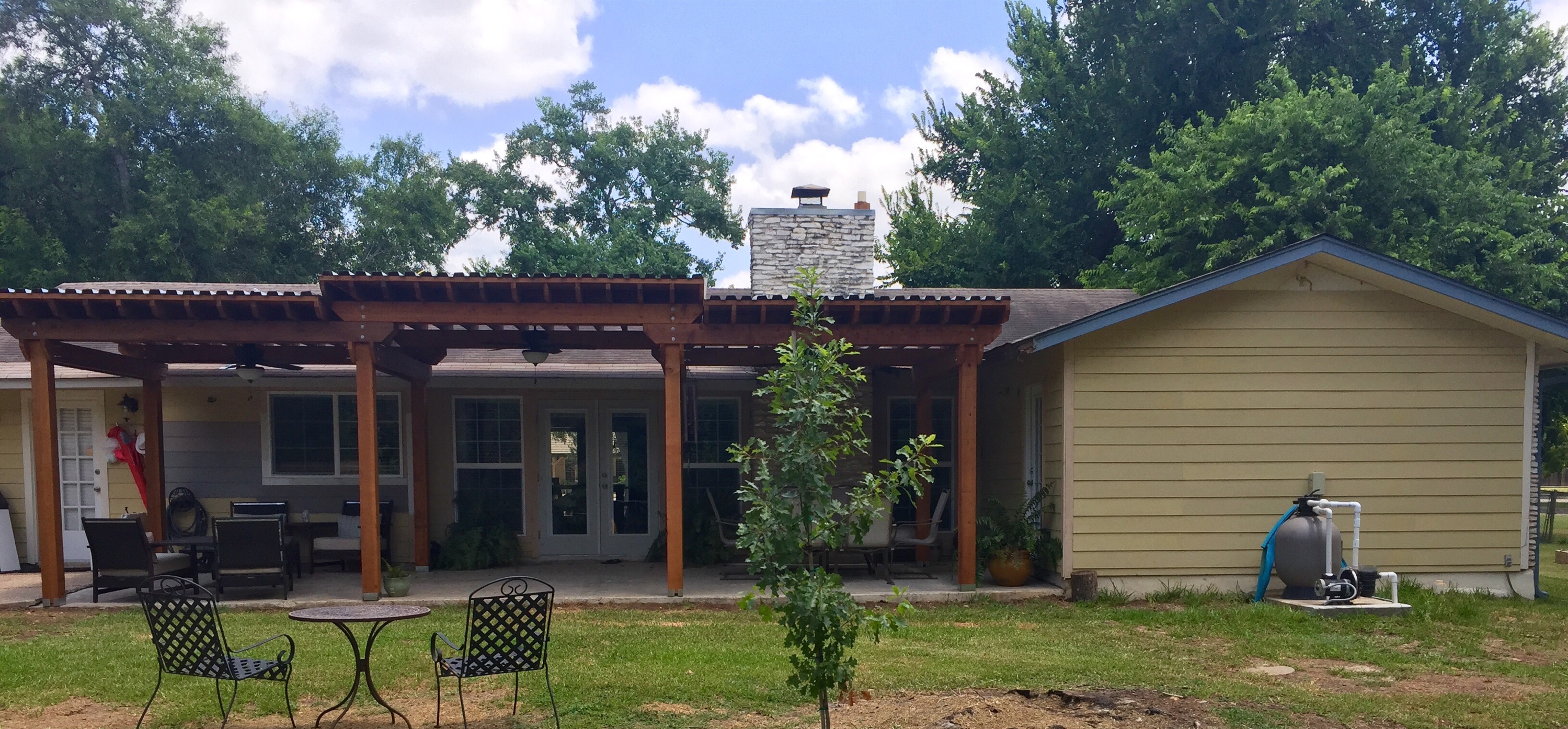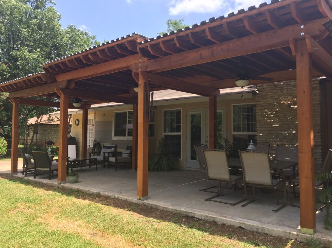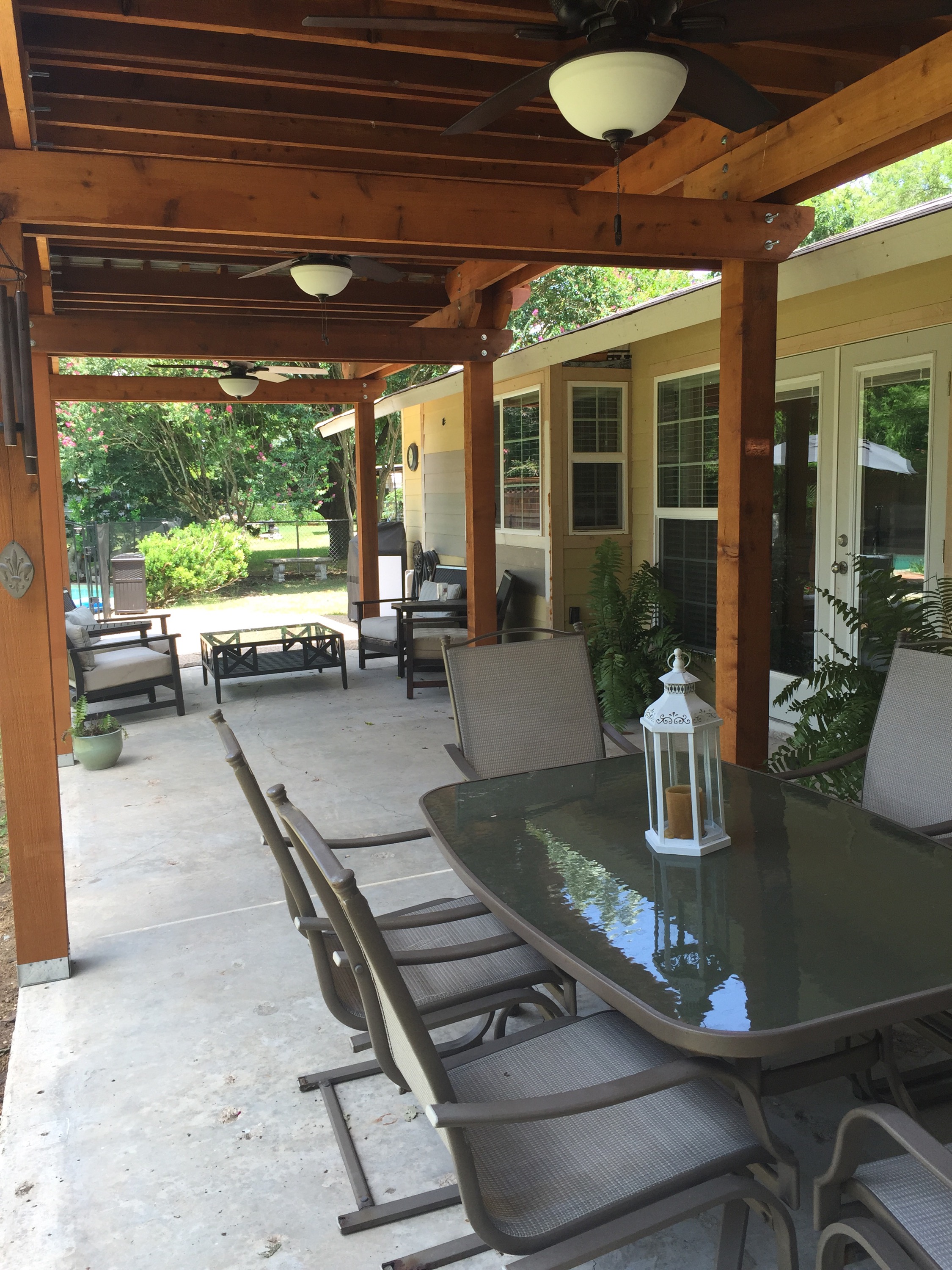 After a couple of weeks of hard work, our pergola is finally completed! We have been here almost a year, and have never really had a good outdoor space to hang out in other than the pool. This pergola was just what we needed to make this house feel like a home! We have been spending lots of time out here lately, and I bring this blog to you from under the pergola 🙂