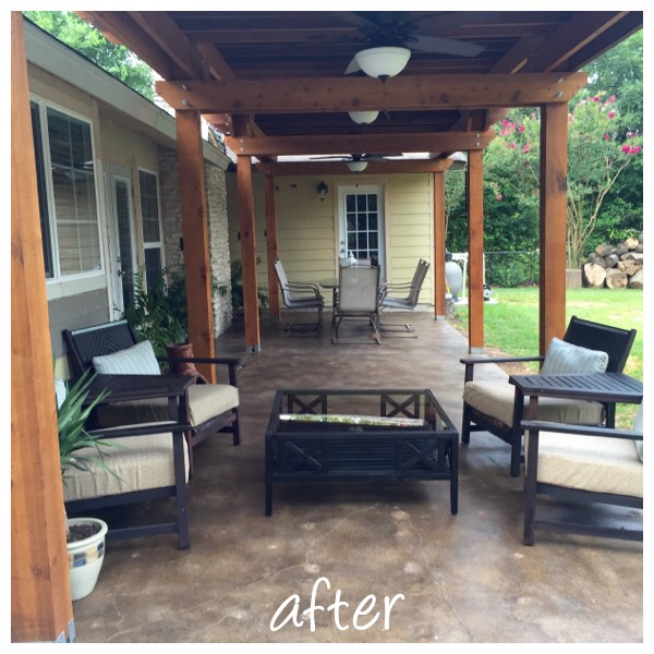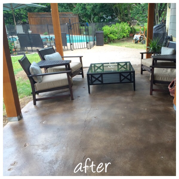 We have known for a while that we wanted to stain our ugly back slab at our current house, but didn’t really see a reason to act on it until the pergola was finished. Trent’s pergola project has been done for a few weeks now and as beautiful as it is, the hideous slab that lived under it was really taking away from its wow factor. Last Saturday Trent spent about 4 hours prepping the slab so that we could begin the staining process. Most slabs would not require this amount of prep work, but ours was in pretty bad shape since the floor boards of the old addition had been glued to it. Trent had to use a grinder to remove tons of caked on glue before he could acid wash the porch. After the porch was cleaned and dry we were ready to start staining. We used Behr stain and do a two phase color technique called Desert Oasis. It combines a base color (Sand) and an accent color (Walnut) and is finished with a wet look sealer.