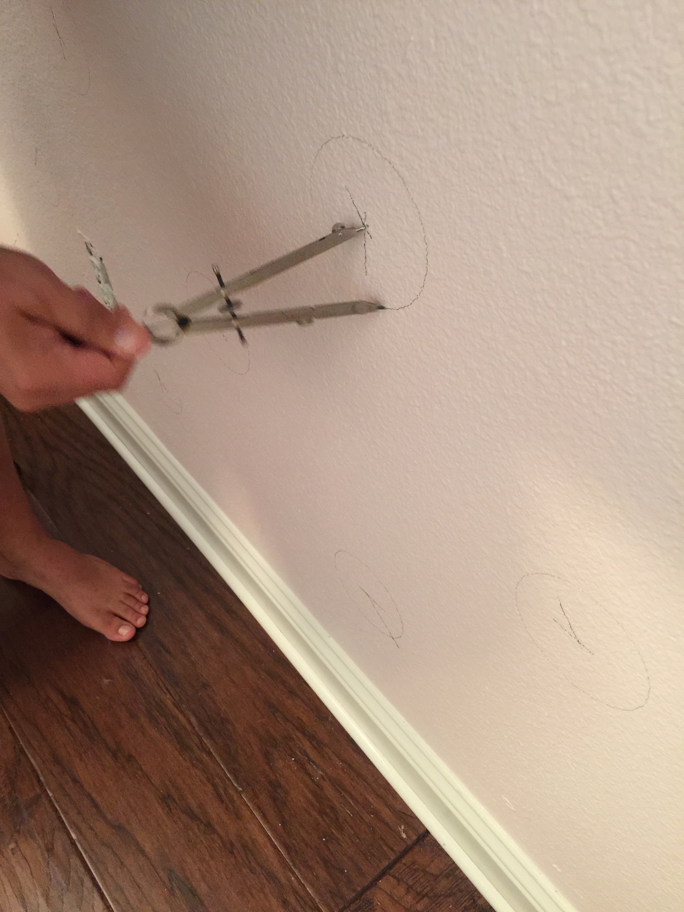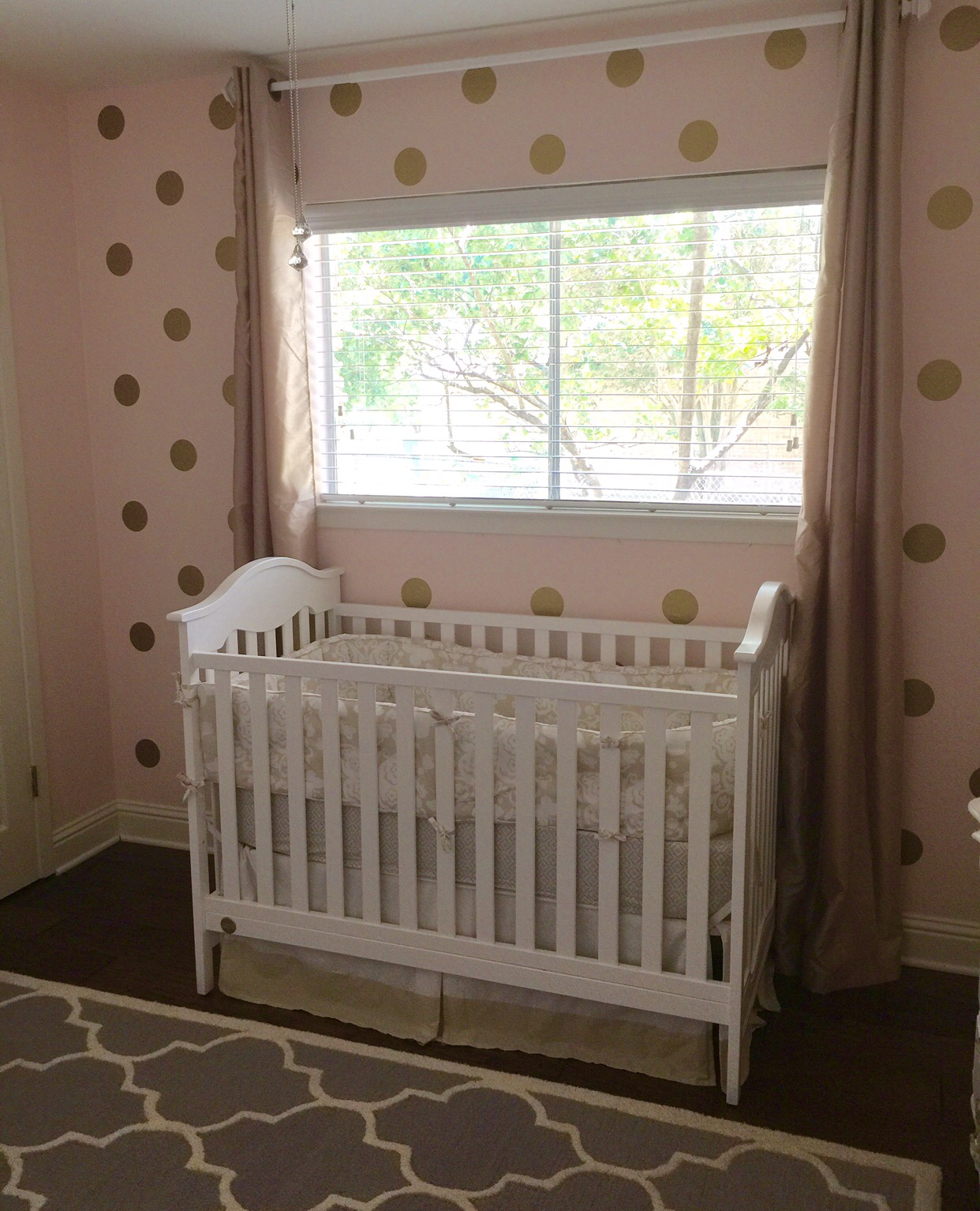 Luckily Baby Sister (as we call her) has a handy dad, otherwise she would not have perfectly spaced gold dots on one of her walls. Trent admitted that the task of evenly spacing the gold dot decals on the wall hurt his brain. Major thinking was involved along with a compass, but as per usual he competed the job flawlessly.