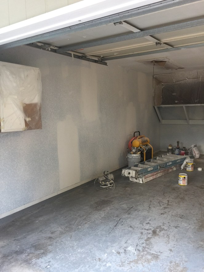 With our house going on the market within the next couple of weeks, it’s been getting down and dirty over at the Bales residence. We finally had the last ugly part of this house de-uglyfied last weekend. It’s safe to say that our garage was a HOT mess. Literally. It had ugly blue walls, ugly popcorn ceilings, ugly worn paint on the floor and the drywall was bowing and sagging in more places than not. The garage was in desperate need of an overhaul. Since Trent lives at our new house 😜 and I am busy managing toddlers, we hired help for this project.