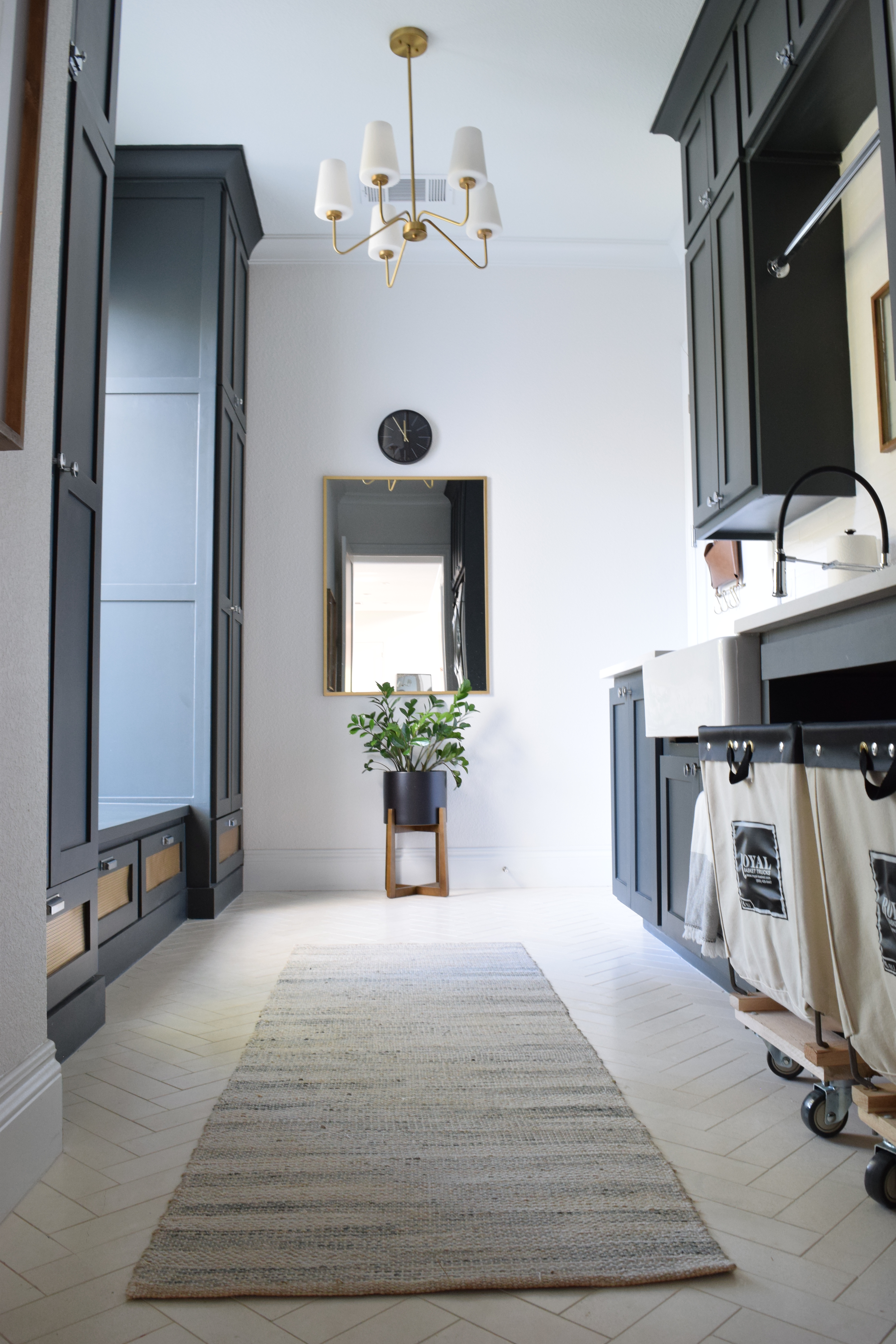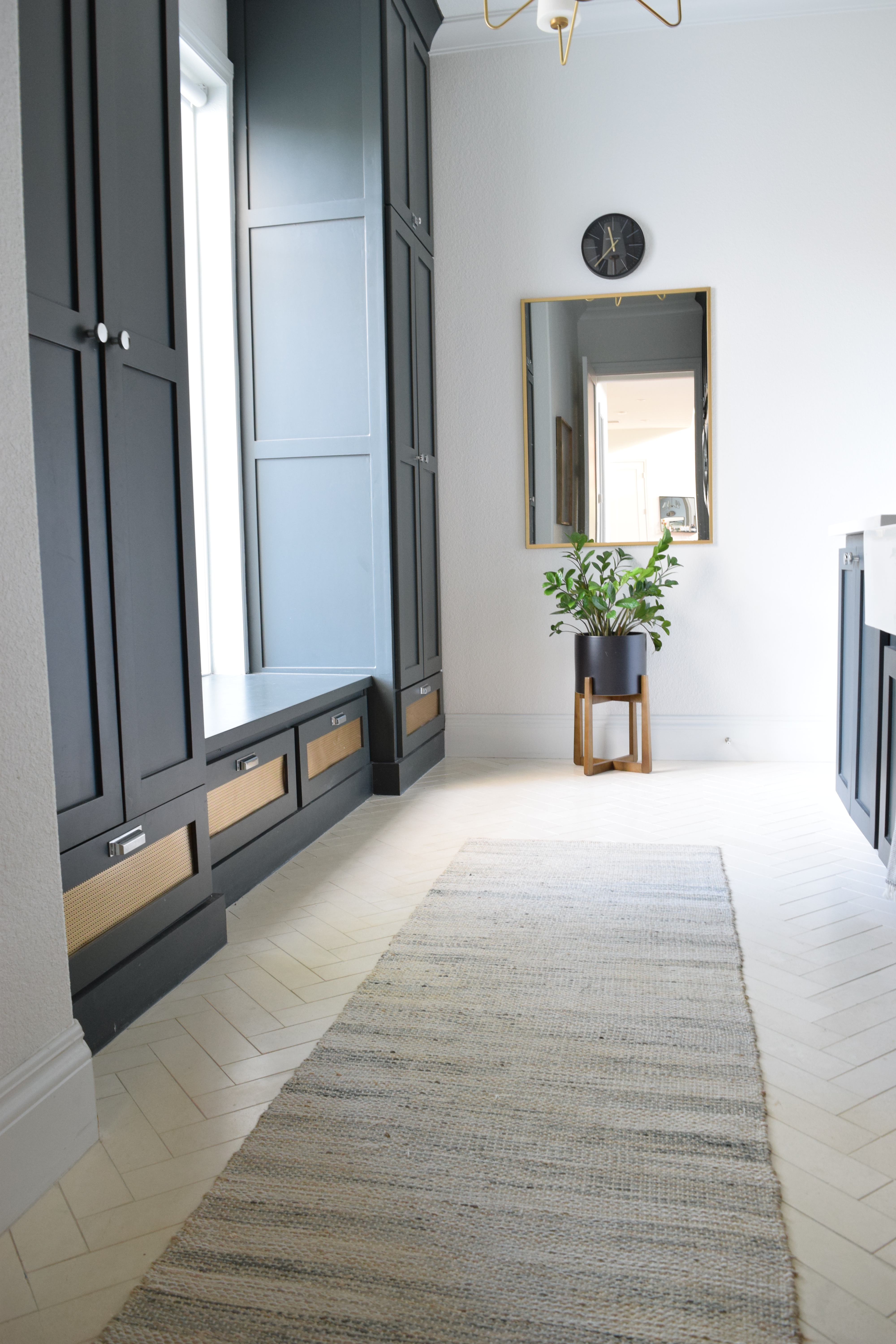 The floors in this room are off-white limestone that we had laid in a herringbone pattern. I was on the fence about white flooring in a mudroom, but they have held up nicely and I honestly prefer to know when the floors are dirty, rather than being hidden 😉. Cause remember, I am a CLEAN FREAK!