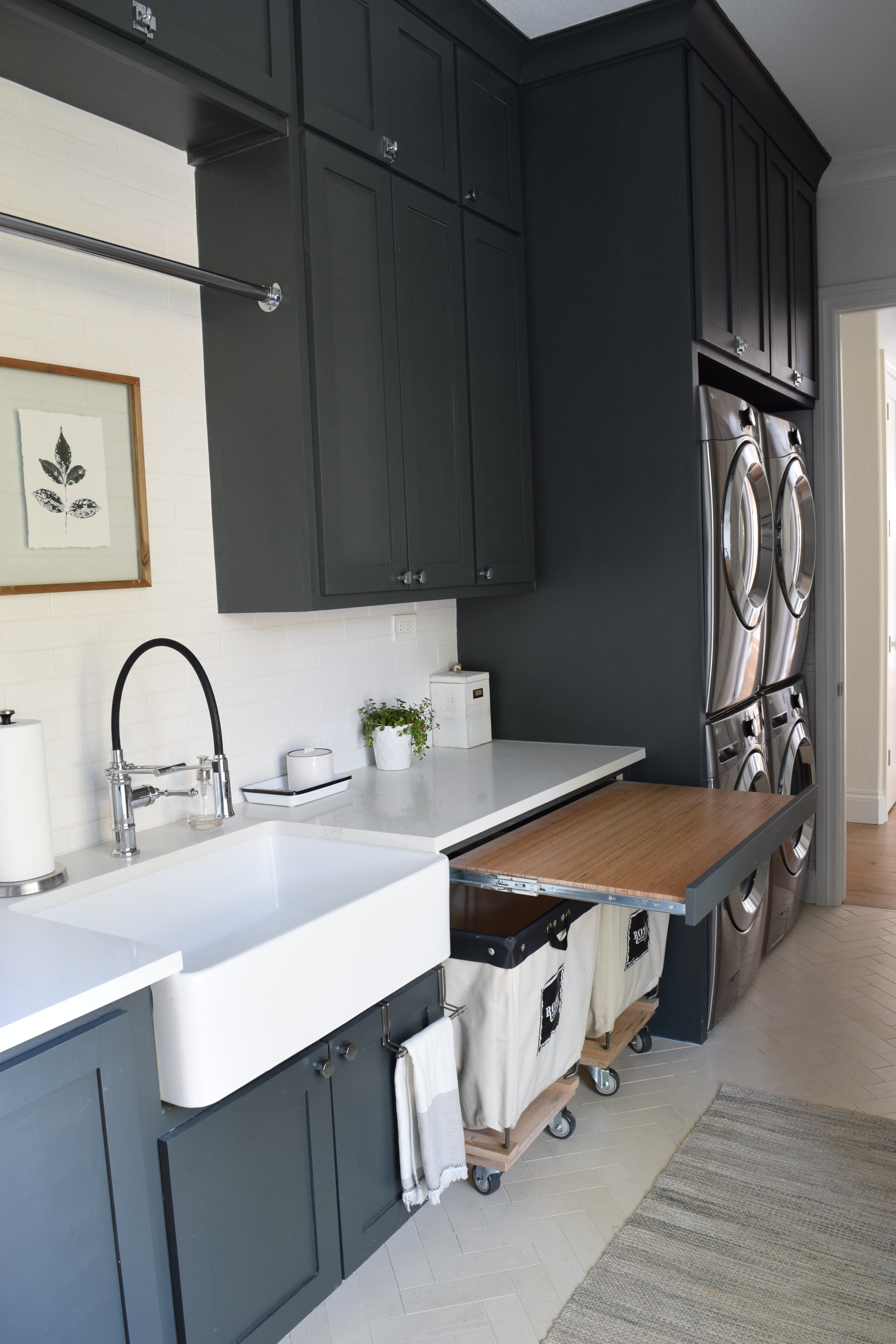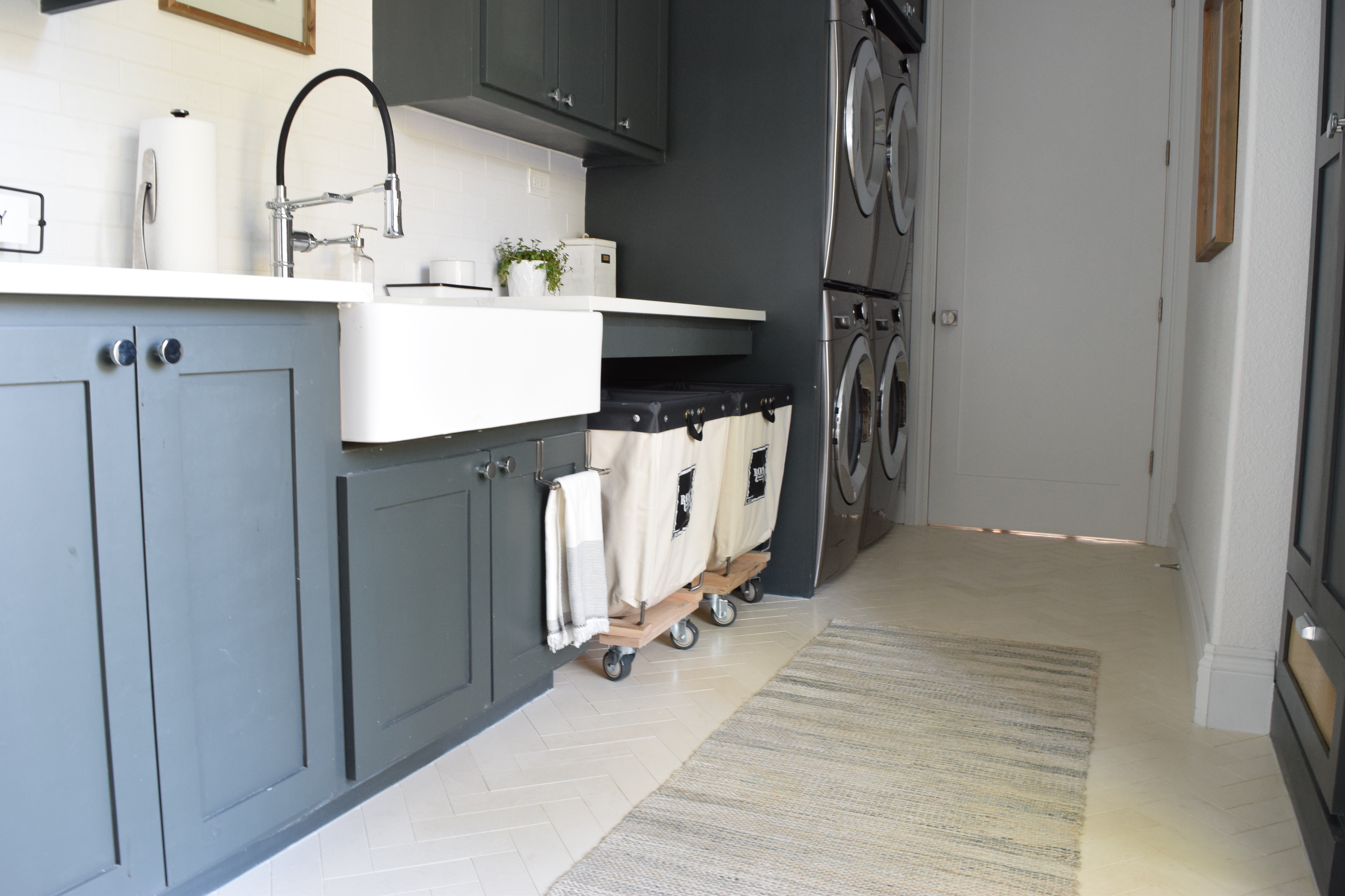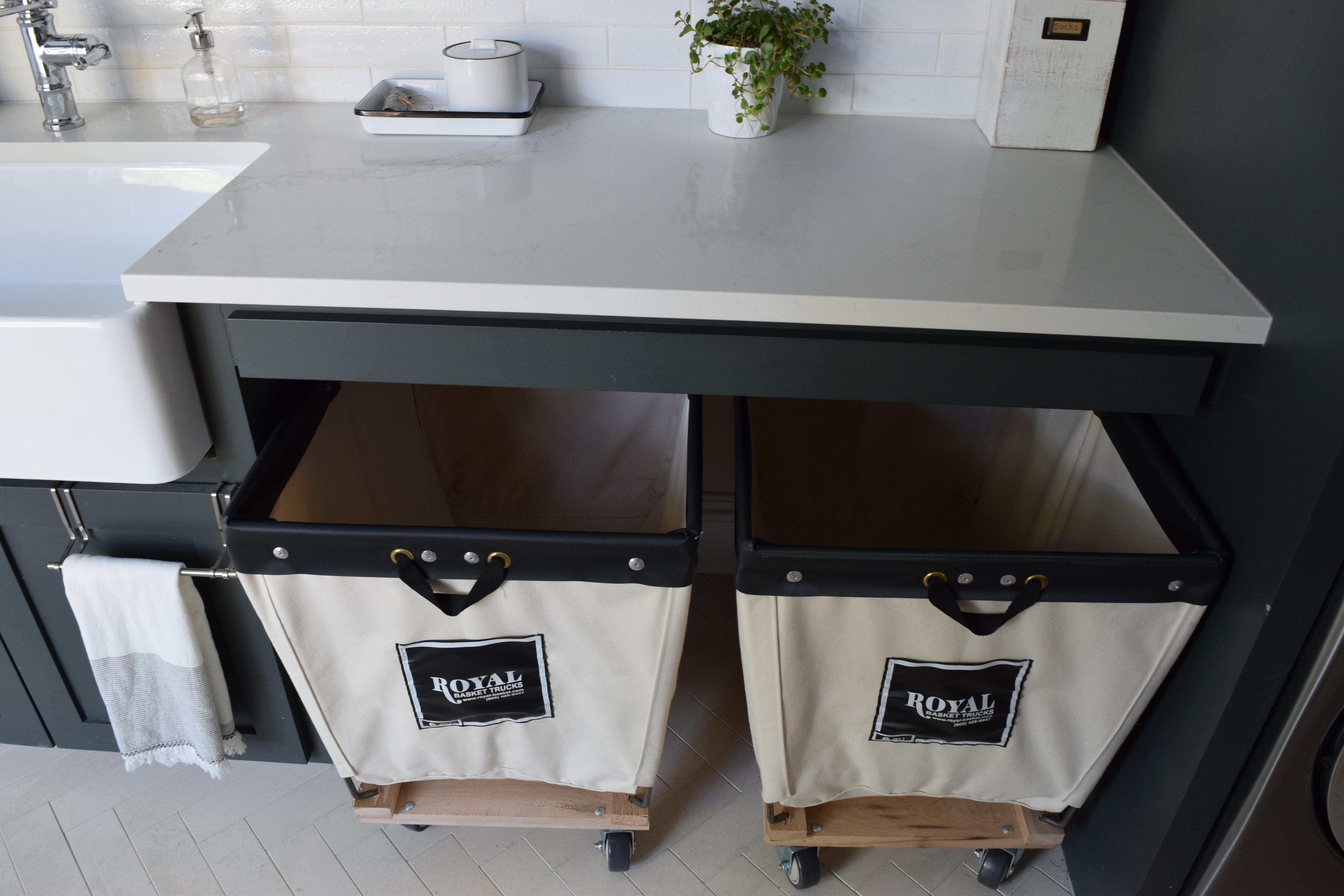 I originally designed the open space below the folding table for Steele brand basket trucks (laundry bins on wheels), but they are super pricey. I ended up finding these Royal Basket Trucks for a fraction of the cost, and the measurements ended up working out better than the ones that I planned for! They also happened to have chrome and brass hardware accents that I didn’t know about when I ordered them, but was so stoked to be surprised with!