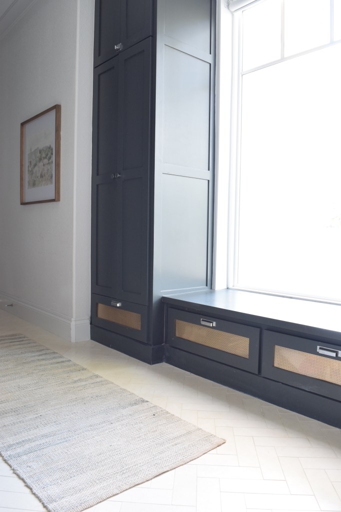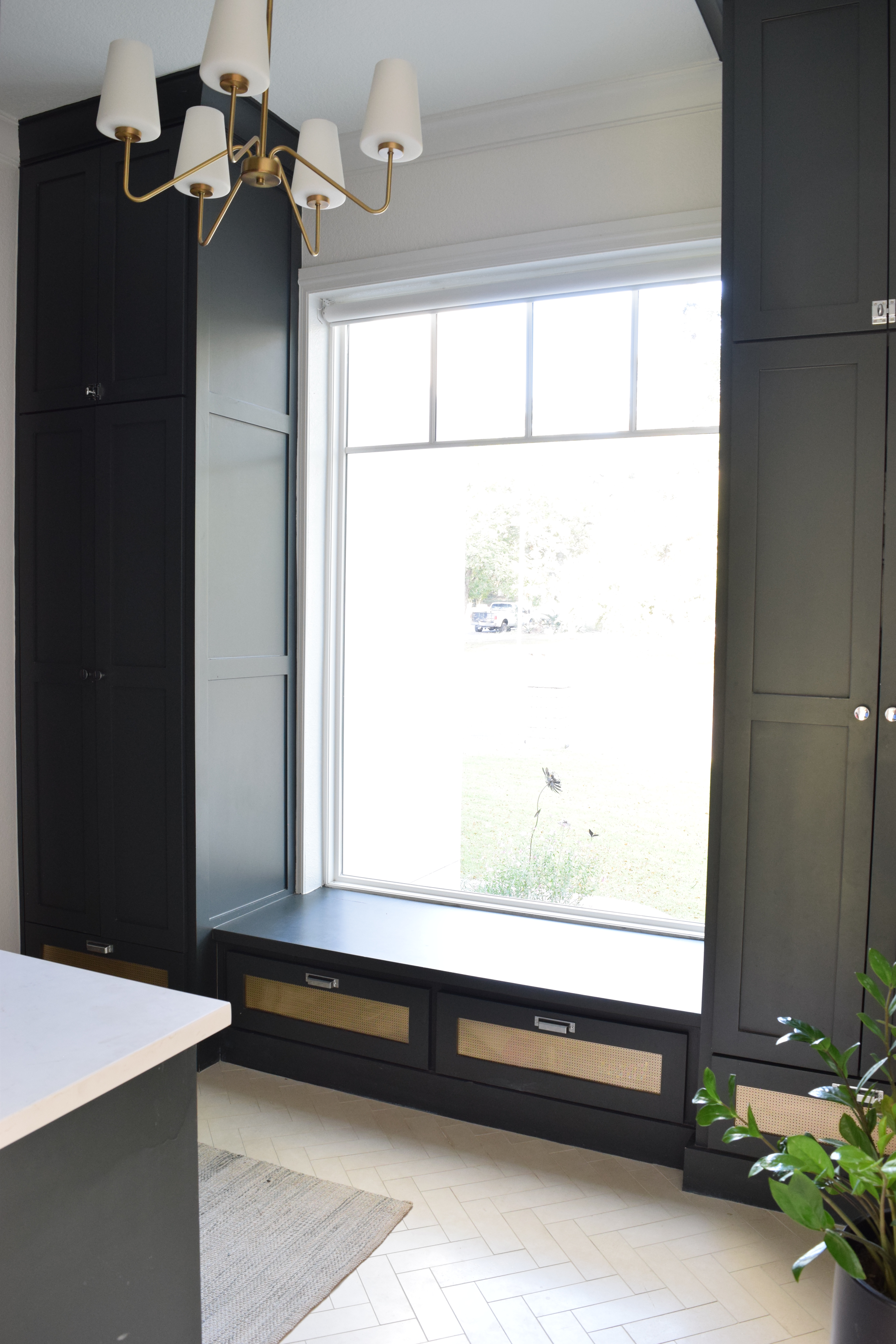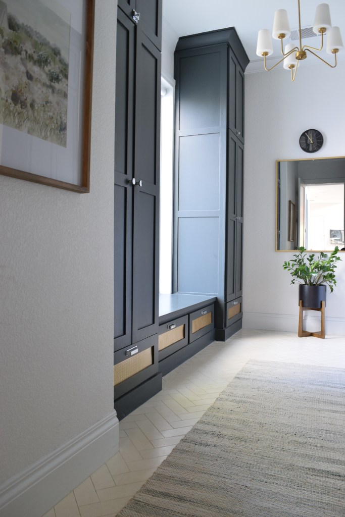 I knew I wanted a large window in here, because – well, I am obsessed with large windows! This window also faces the street so it provides good people watching while folding laundry😜. We built “lockers” around the window that have hanging rods for coats/bags, and shelving for socks and other random items that are best stuffed in a closet.