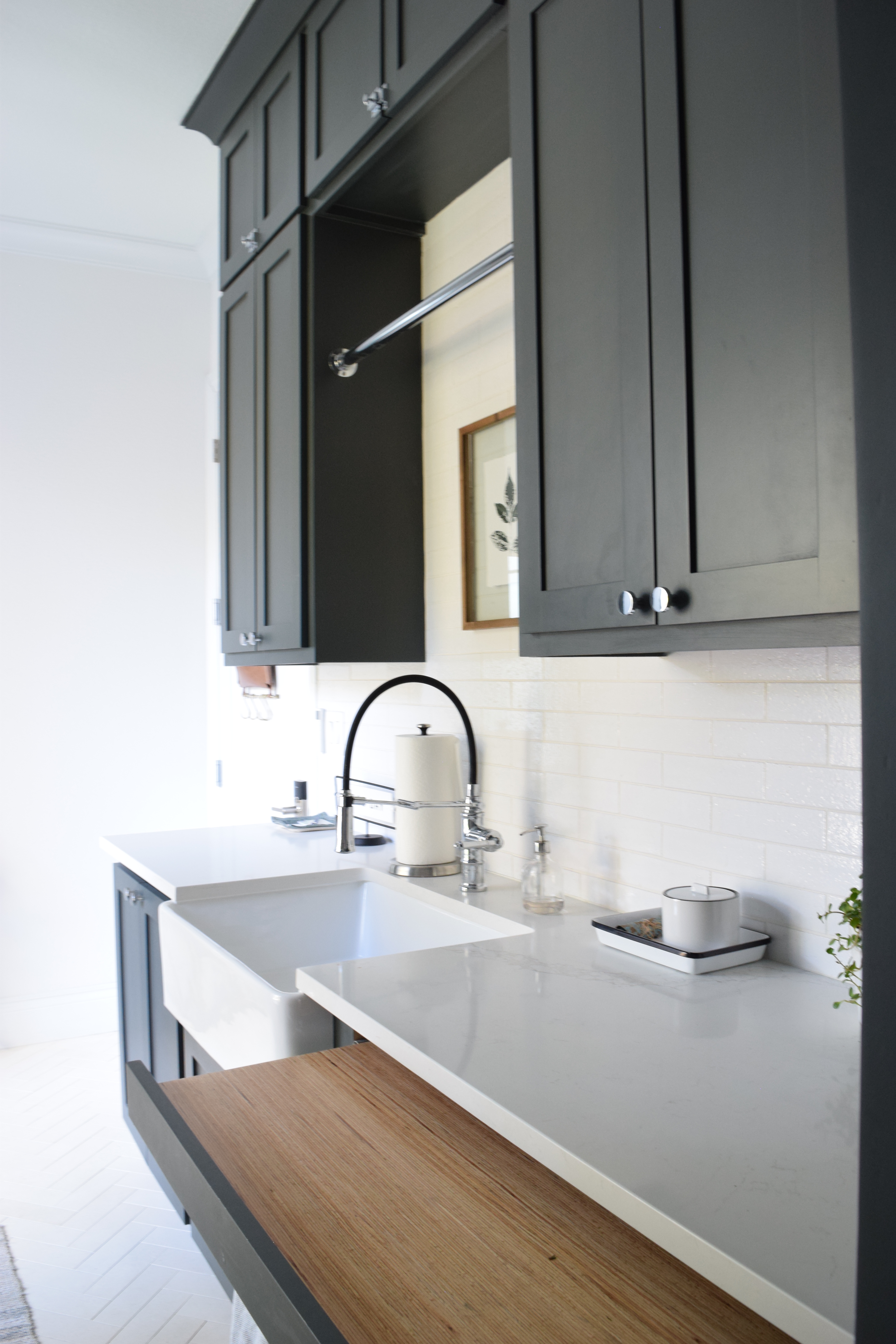 Our last two laundry rooms had white IKEA cabinets, so I wanted to do something a little bolder in this home for a change. I stumbled upon this beautiful deep green paint and was sold! It provided the drama that I was looking for while not being black. I already had my mind set on a black built in china cabinet (kitchen/dining reveal coming soon (you know, in the next year or so)) and didn’t want to repeat colors.