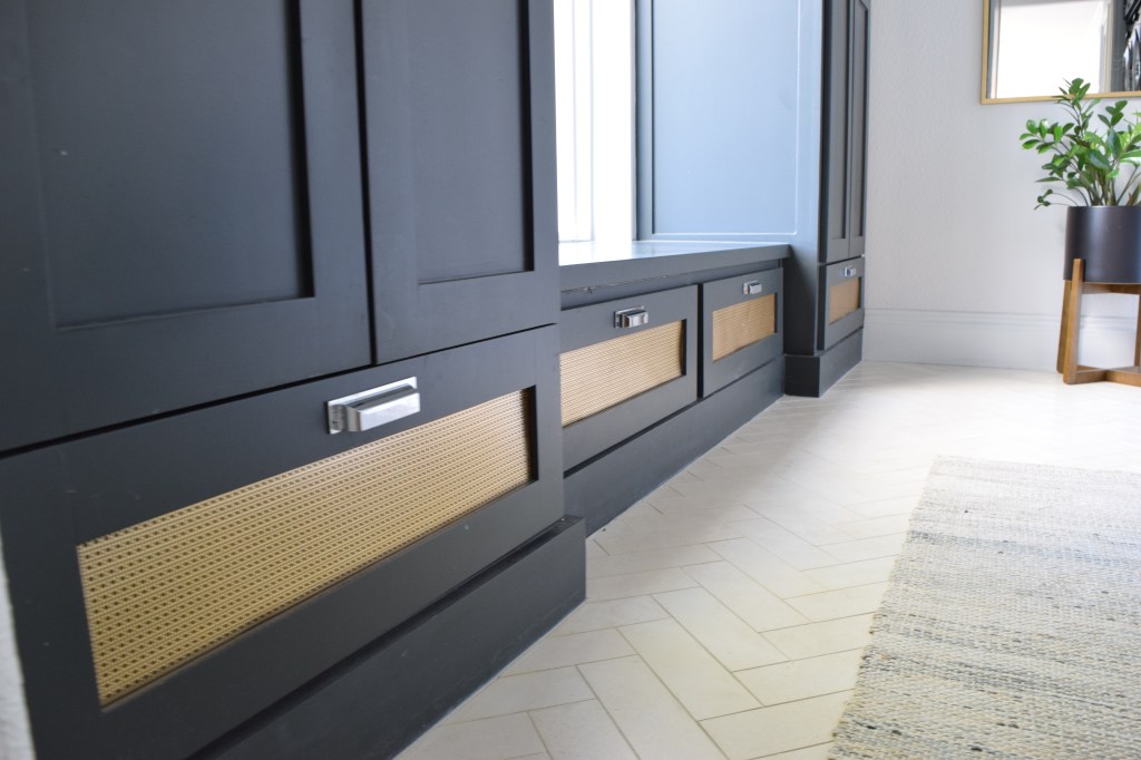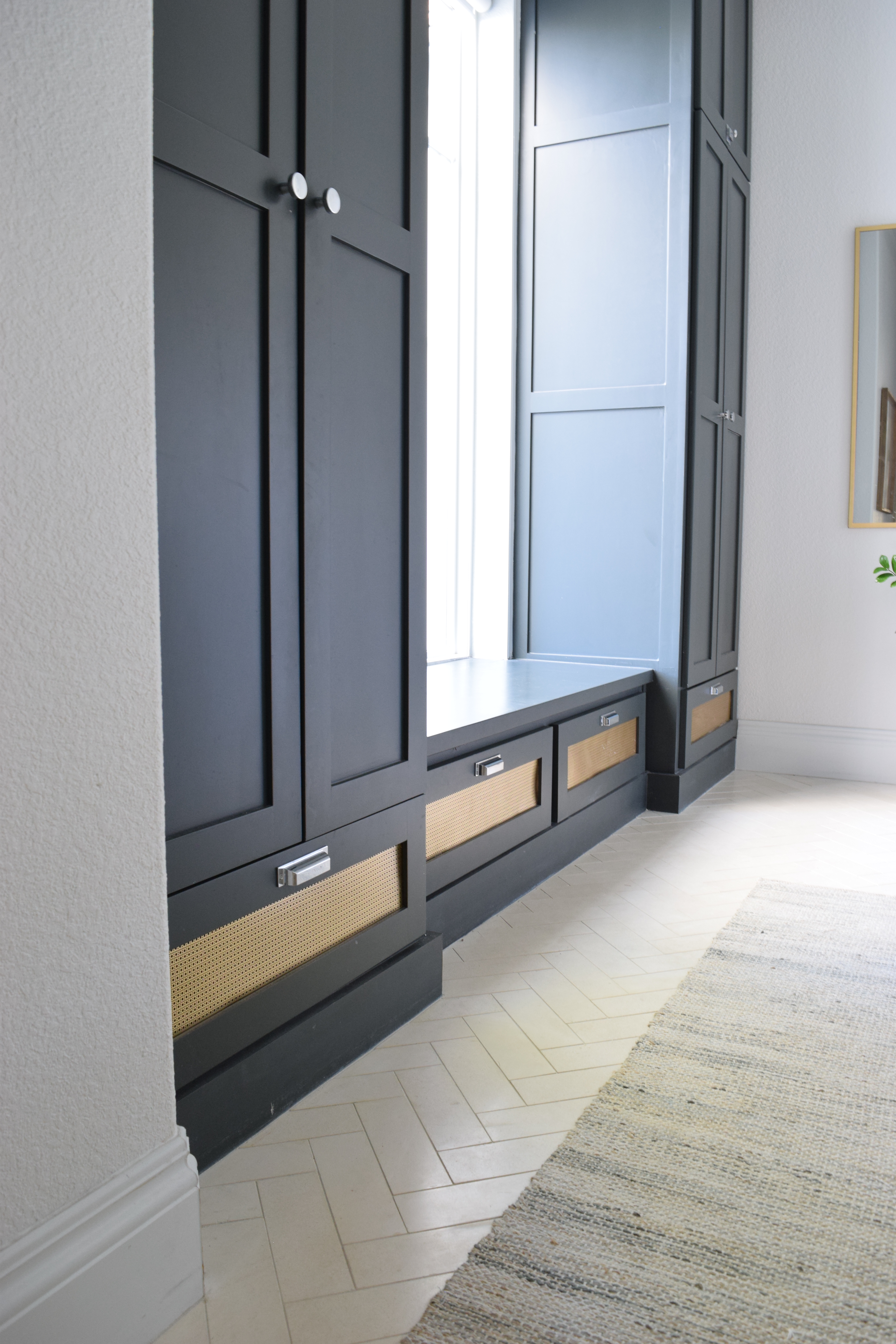 Another MUST was shoe storage as we are a shoe-free house, so we added 4 shoe drawers under the window seat/lockers. To prevent shoes from getting stinky, the shoe drawer fronts are metal mesh which allows for air flow. Pretty and functional – my absolute favorite combo!
